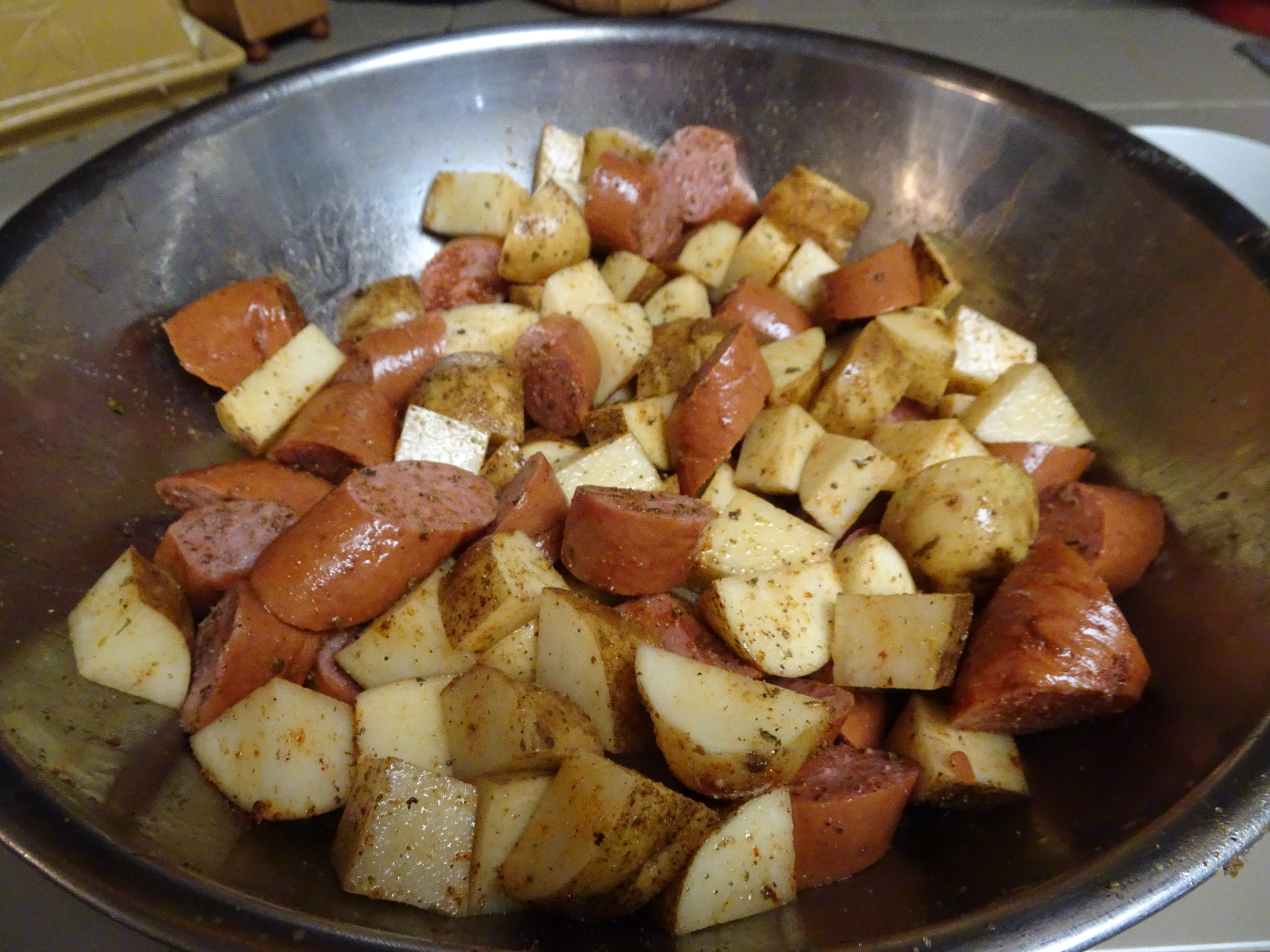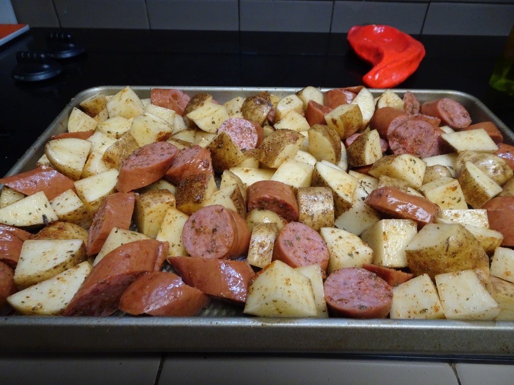 Scrub potatoes well. Cut the potatoes into 1-inch cubes and place in a large mixing bowl. Slice the smoked sausage into 1/4-inch pieces on the bias. Add to the potatoes. Drizzle sausage-potato mixture with remaining olive oil. Toss to coat. Sprinkle seasoning over sausage-potato mixture. Toss to coat.