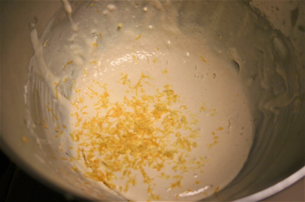 Beat pancake mix, milk, egg and sugar in the bowl of a stand mixer until just blended. Zest lemon into the batter. Fold in. Let batter rest 15 minutes.