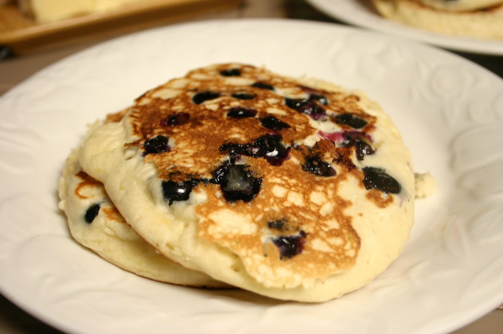 Ladle pancakes onto the griddle. Working quickly, top each pancake with a handful of blueberries. Cook about 2 or 3 minutes. Flip pancakes, increase heat to medium and cook another minute or so.