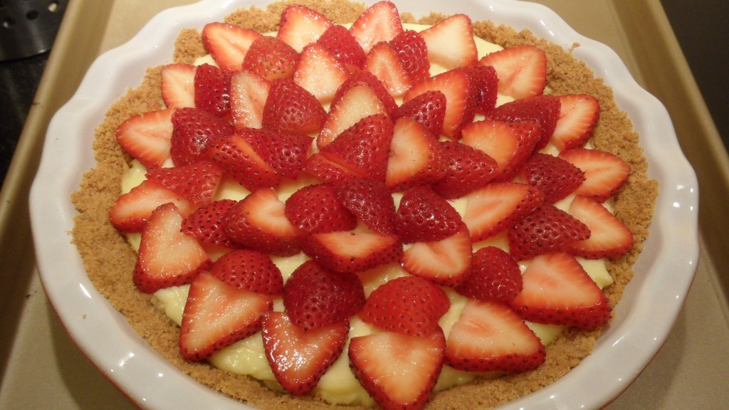 Before serving, let the pie come to room temperature for 30 minutes. While the pie sits, clean and slice the strawberries. Arrange sliced strawberries in a spoke pattern over the top just before serving.