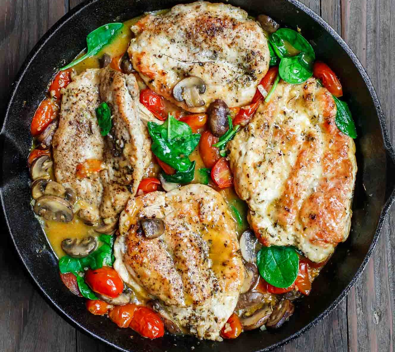 Remove from heat, scatter spinach over the chicken. Serve directly from the skillet for a rustic feel.
