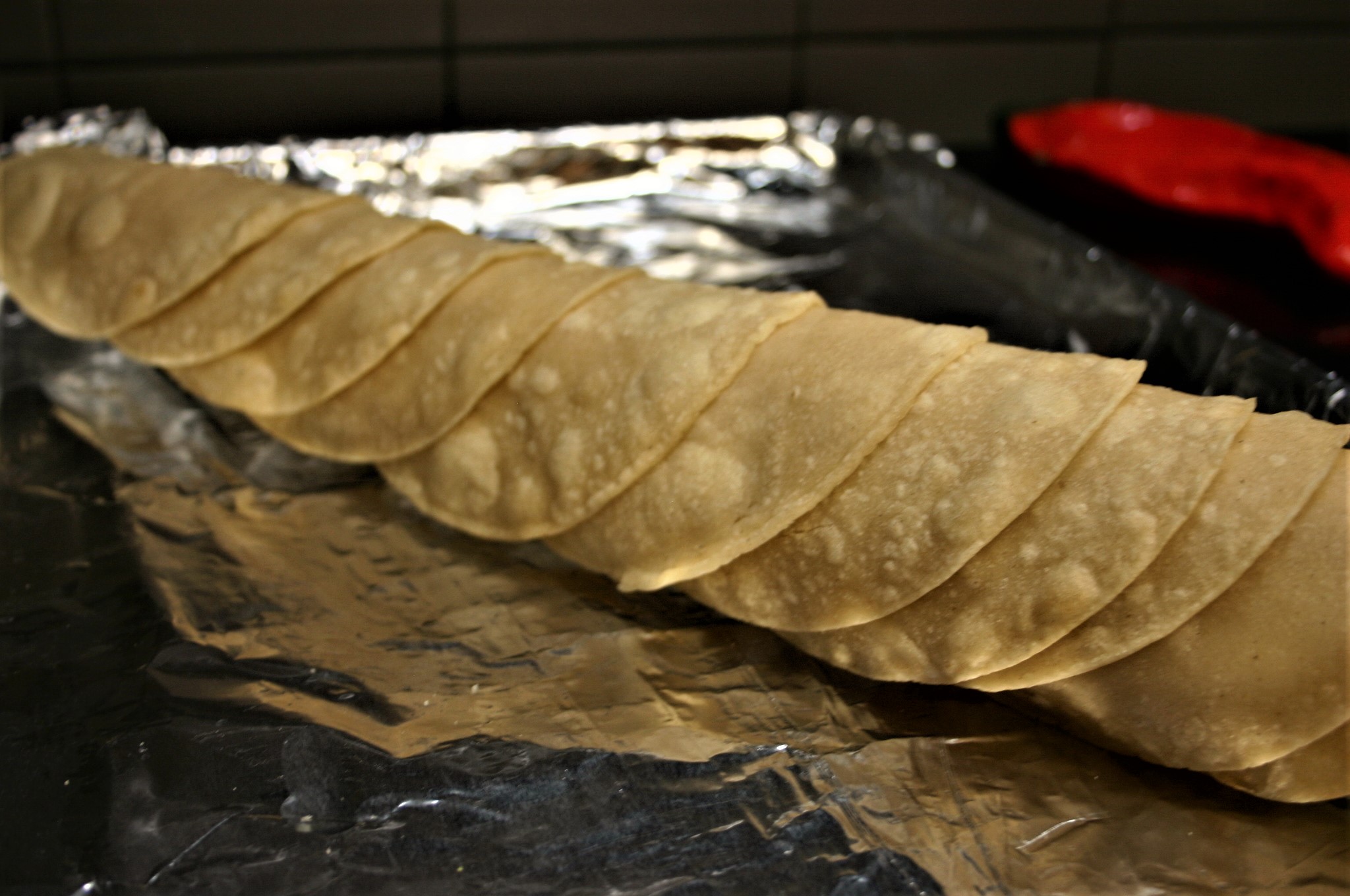 Once the oil is hot, place 3 tortillas into the oil with tongs. Cook for about 8 seconds. Turn over and fry for another 8 seconds. Drape tortillas, one at a time, over the rolling pin, tortillas slightly overlapping. Gently press the tortillas with a paper towel to absorb any excess oil and shape into a shell. Repeat until all the tortillas are lined on the rolling pin. Once all the tortillas have been quick fried, hold in a warm oven until ready to serve.