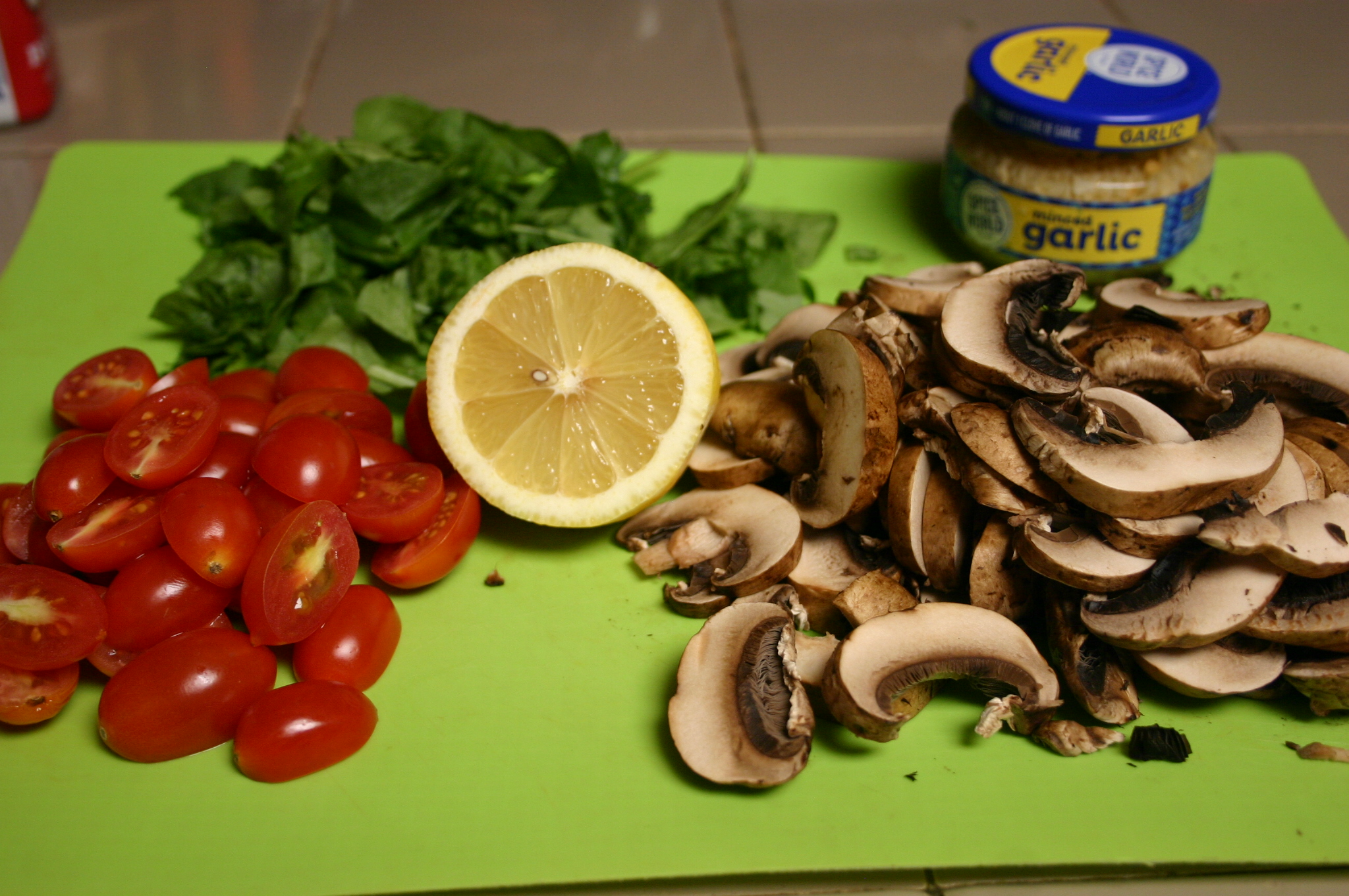 Cut chicken breasts lengthwise to create 4 thin cutlets. Set aside. Clean, trim and slice mushrooms. Set aside. Cut tomatoes in half, set aside. Cut lemon in half. Reserve half for another purpose. Set remaining half aside.
