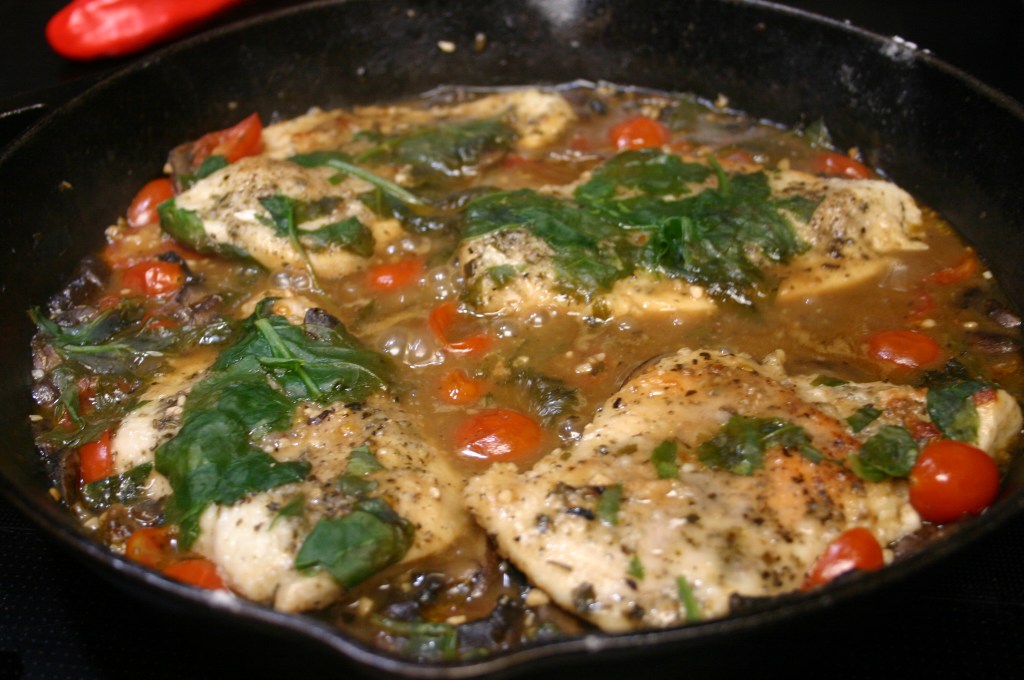 Heat 2 tablespoon olive oil in a large cast iron skillet with a lid. Brown the chicken about 3 minutes per side. Transfer the chicken to a plate, keep warm.