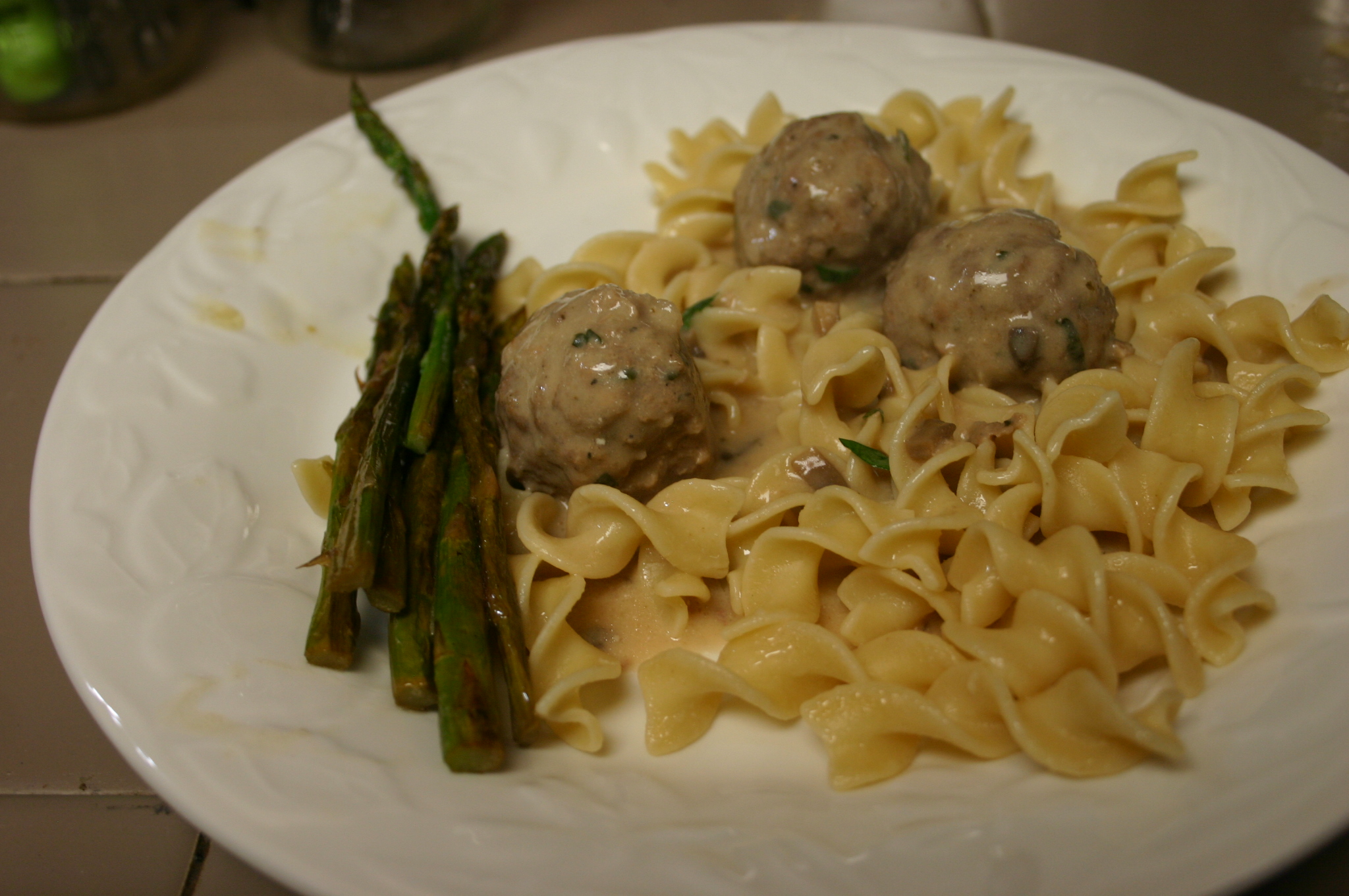 Unfortunately, when we got to the market one key ingredient was missing – Red Currant Jelly. How the heck do I make a Red Currant Sauce without Red Currant Jelly? The answer is simple – you don’t. But that didn’t mean I couldn’t make a throw back Swedish Meatball supper. I remember when every kitchen had a copper chafing dish on top of the refrigerator and every cocktail party included meatballs cooked in mushroom soup. What made American housewives think they were serving up Swedish Meatballs is beyond me. These were just meatballs in soup. However; that very retro concept became a jumping board for a slightly tweaked throwback recipe. The meatballs have been highly seasoned, with toasted breadcrumbs and grated onions. The soup-based sauce is created with a Garlic Mushroom Soup, with additional mushrooms and sour cream. Served over noodles, it was reminiscent of both recipes. Perfect for National Mushroom Day. Enjoy!