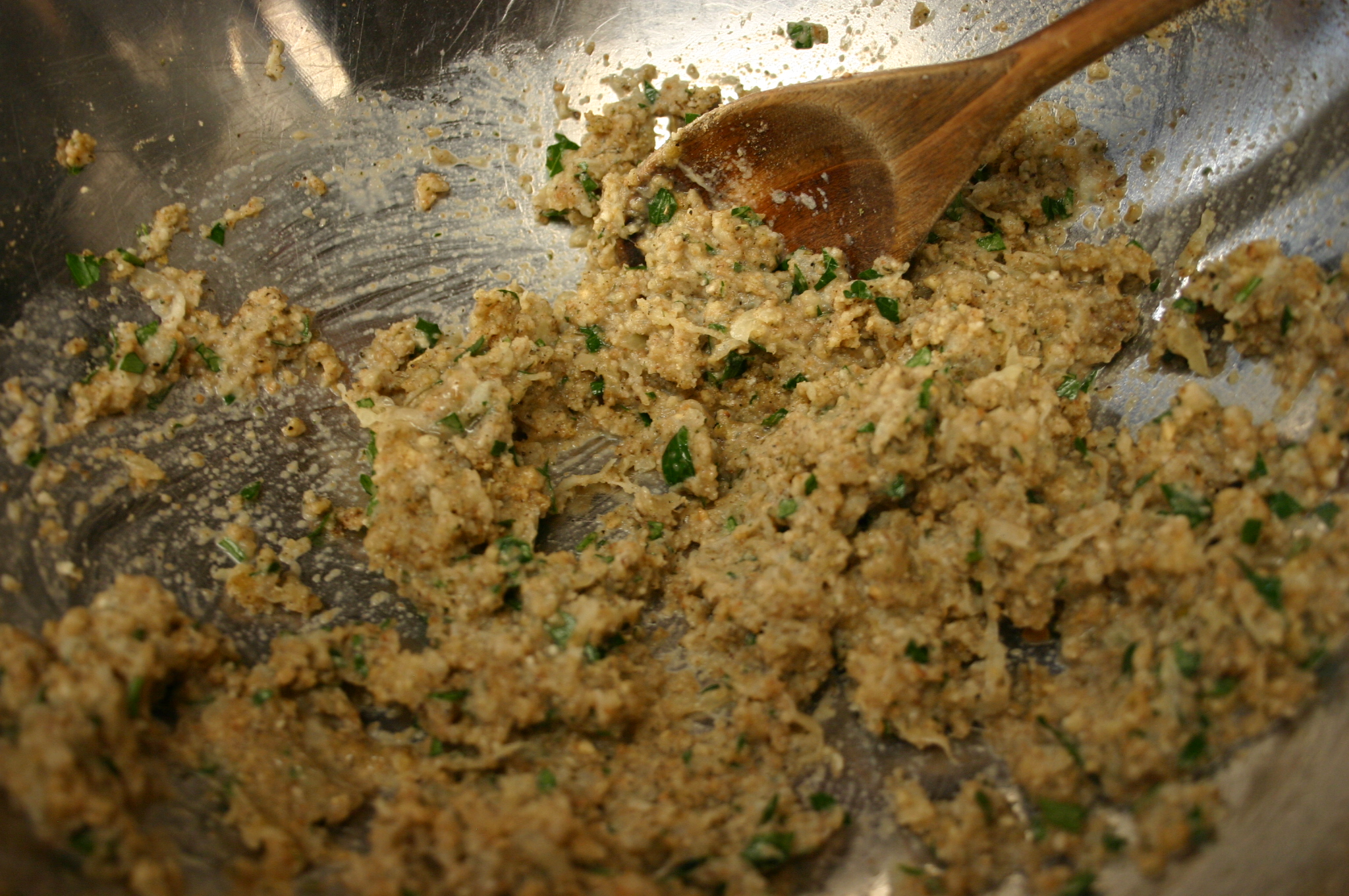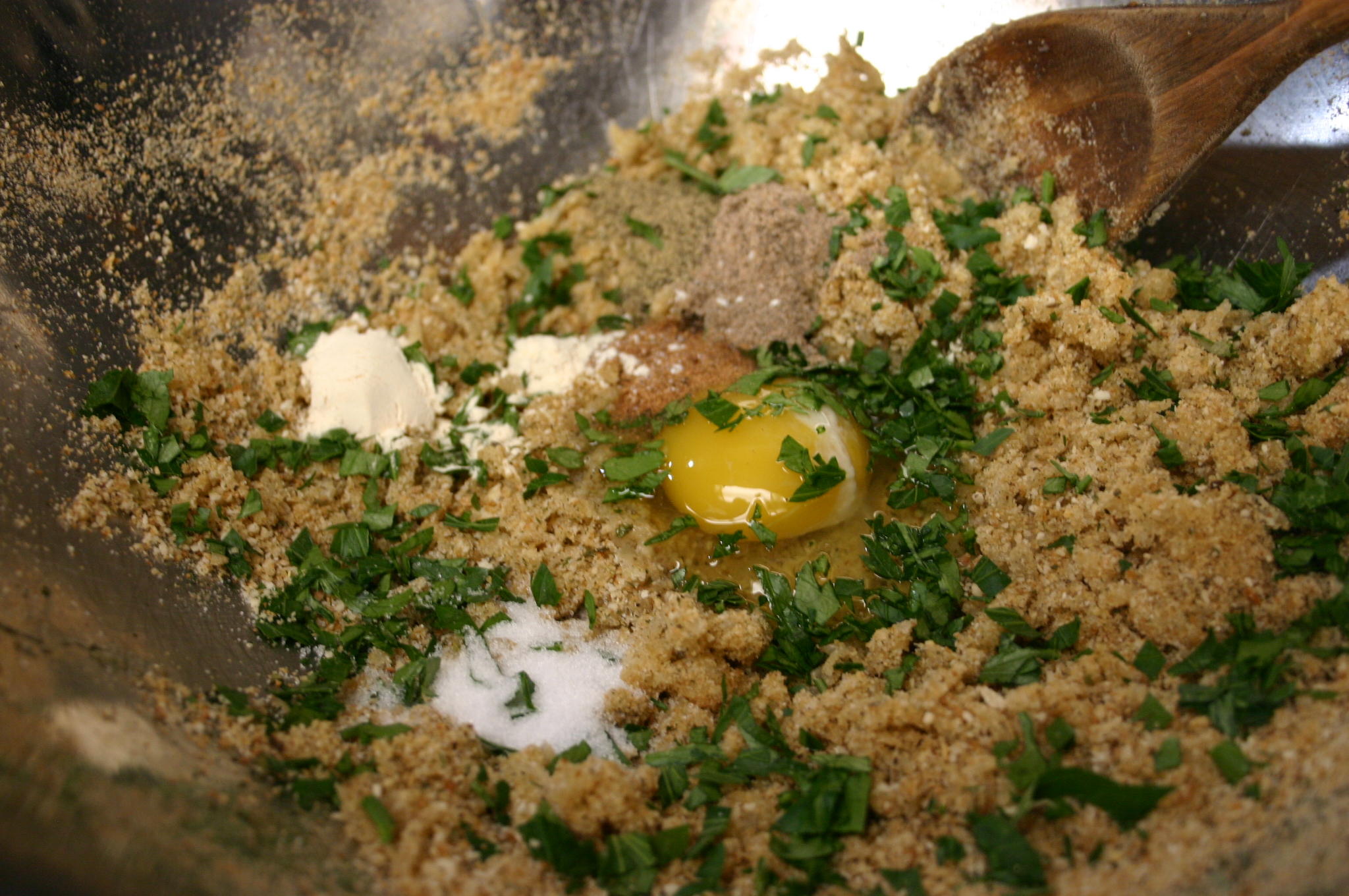 Wipe skillet clean of any crumbs. Add olive oil, swirl pan to lightly coat. Sauté onions until soft and just beginning to caramelize. Add onions to the bowl. Add egg to the breadcrumb mixture. Season with Nutmeg, Cardamom and Garlic Powder. Lightly mix.