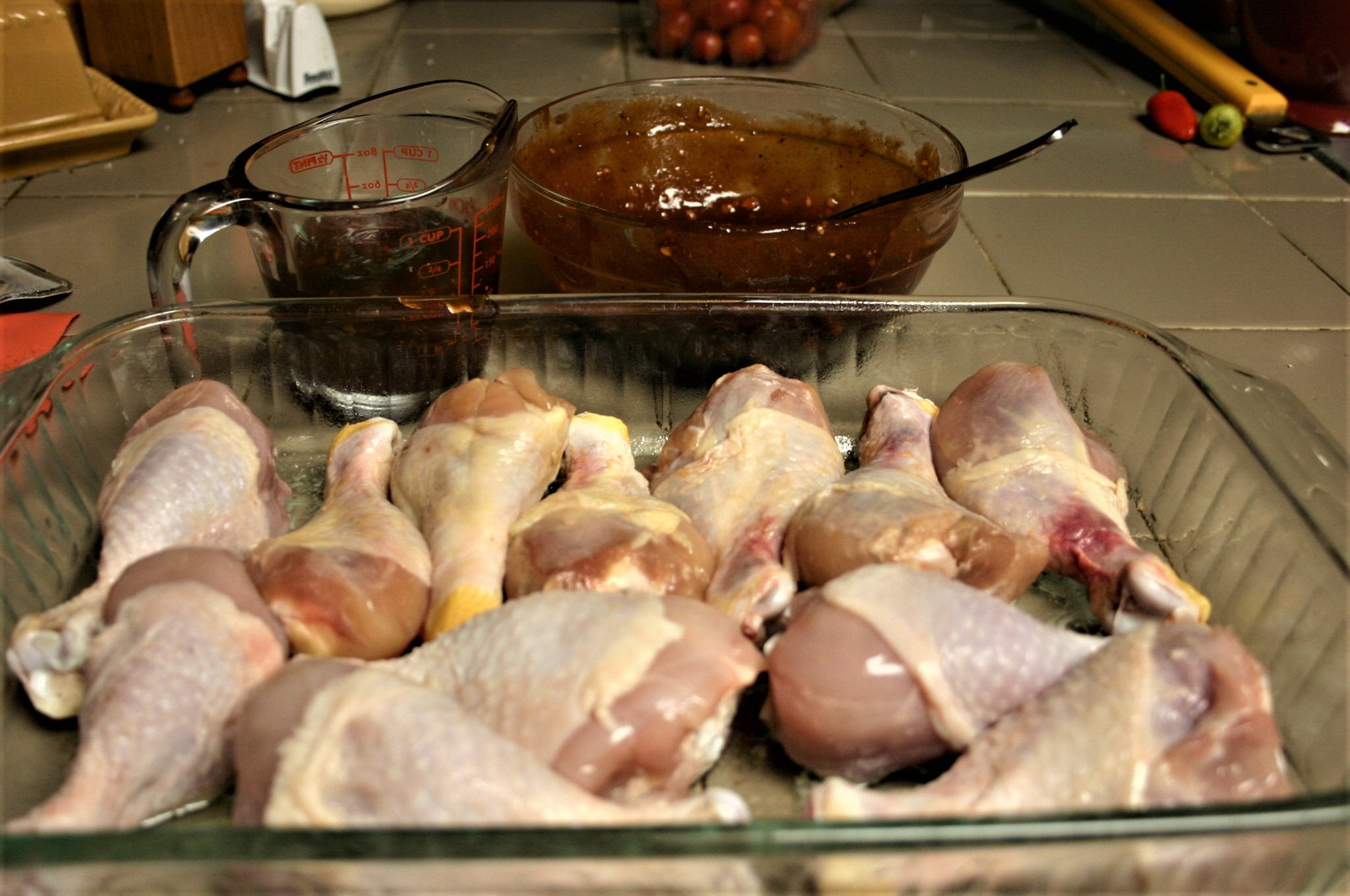 Spray 9-inch by 13-inch baking dish with cooking spray. Arrange drumsticks in the dish, set aside.