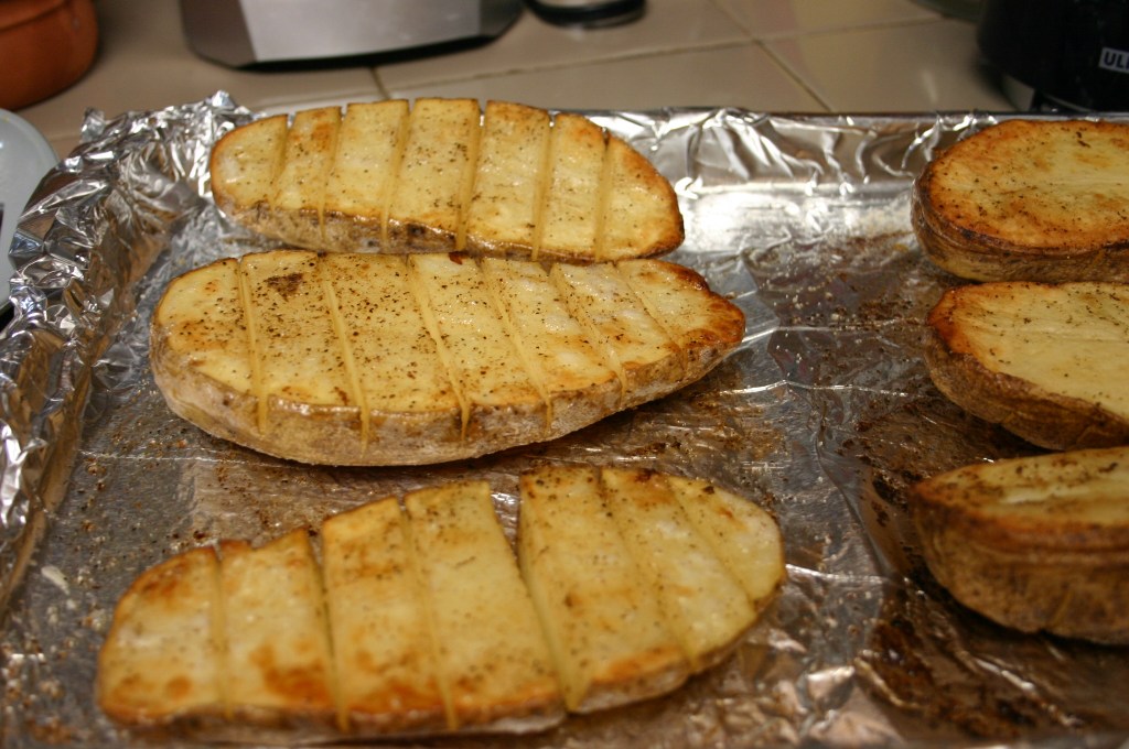 Scrub potato skins. With a sharp knife, cut potatoes in half lengthwise, Lay potatoes cut side up. Score each half widthwise with 6 deep slits. DO NOT cut all the way through. Fan potatoes slightly. Place potatoes on the prepared baking sheet, set aside.