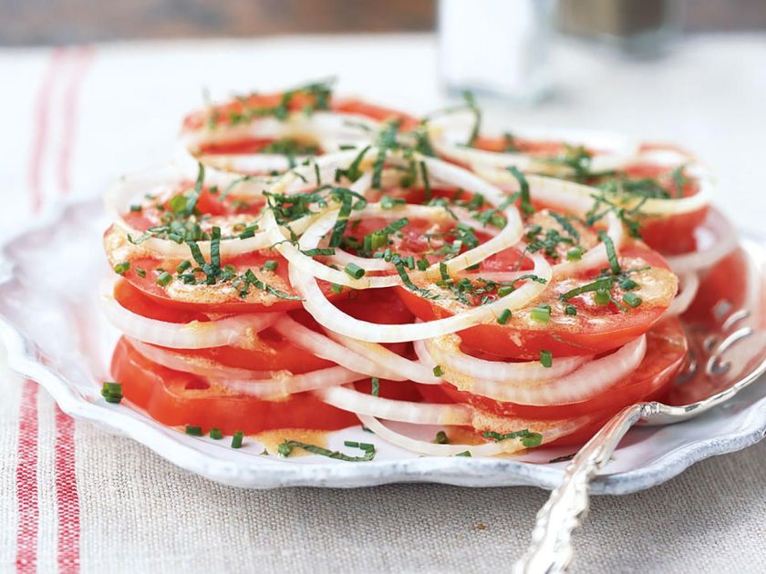 On a serving platter, alternate tomato and onion slices. Season with a sprinkling of salt. Scatter mint and chives over the tomatoes. Cover with plastic warp until ready to serve.