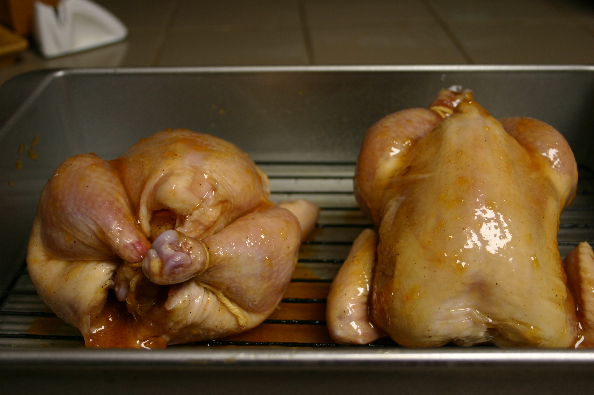 Cut orange into quarters. Peel and stuff two orange quarters into cavity of each Cornish hen. Tuck wings under the bird, tie legs together. Season birds with salt and pepper, place in the prepared roasting pan. Set aside.