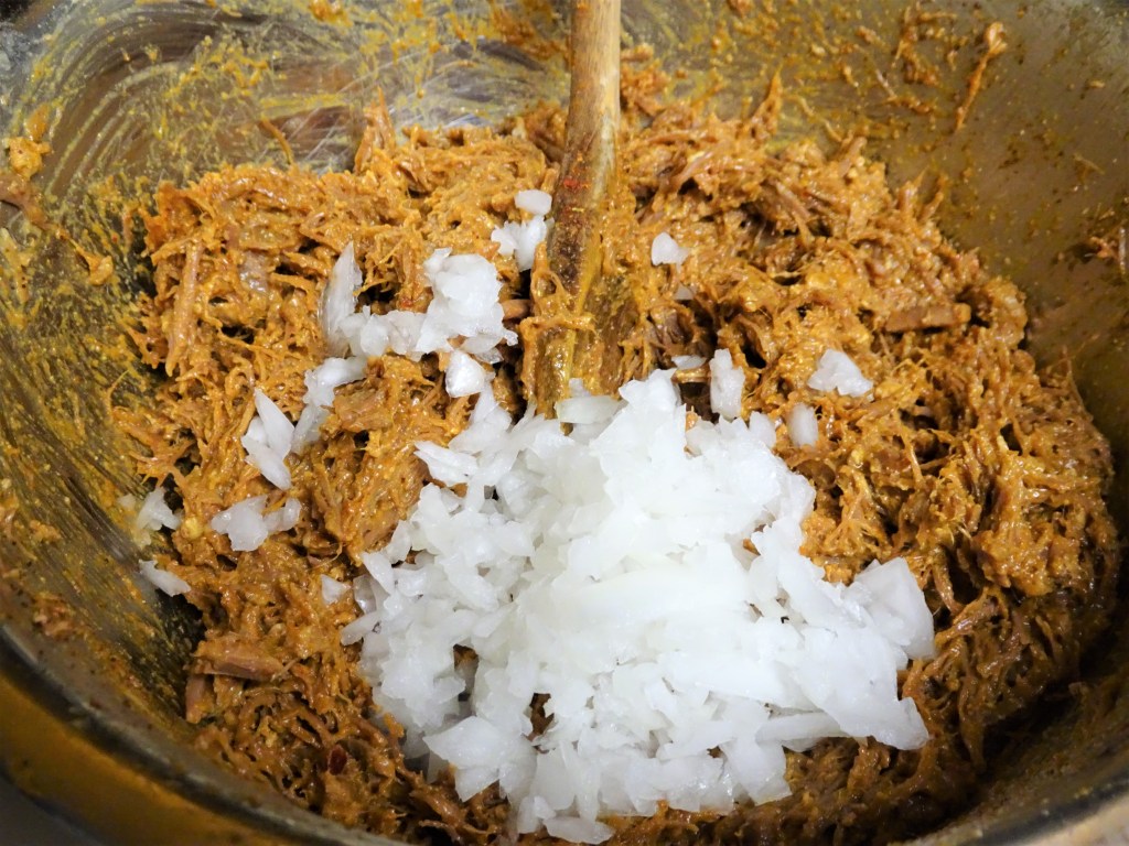 Dice onion, add to the meat mixture. Taste, adjust seasoning with salt and pepper. Set filling aside.