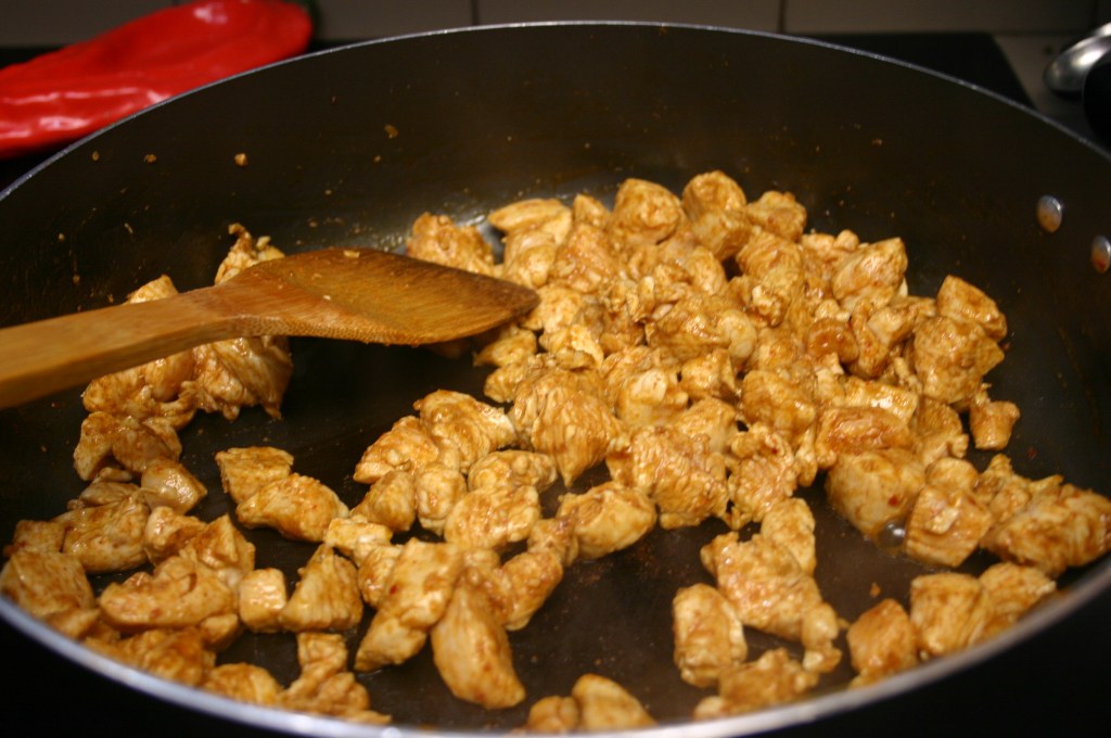 Heat a skillet over medium heat. Add olive oil, swirl the pan to coat the bottom. Add chicken. Cook, stirring frequently, until no longer pink and cooked through.