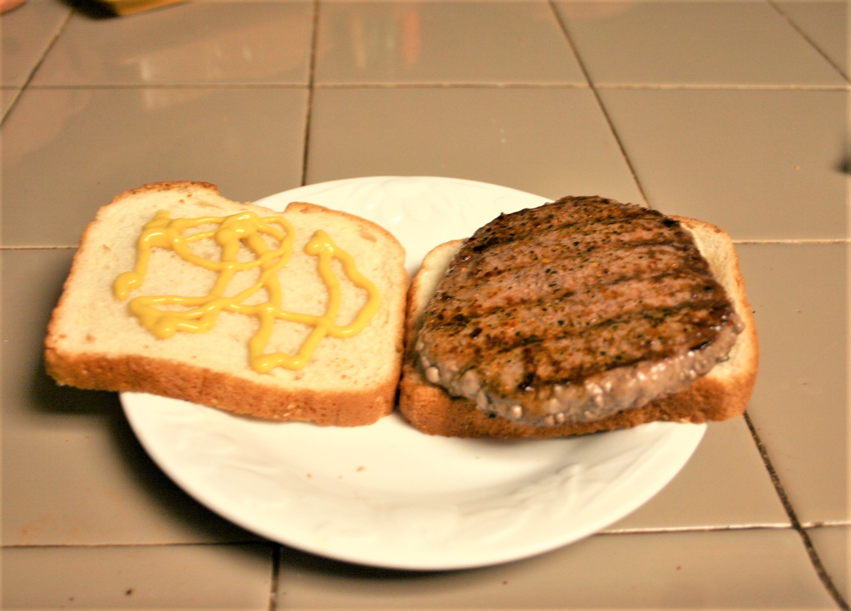 Lay four slices bread on individual plates. Smear with some mustard. Top one slice of bread with a hamburger, top burger with remaining bread. Serve and enjoy.