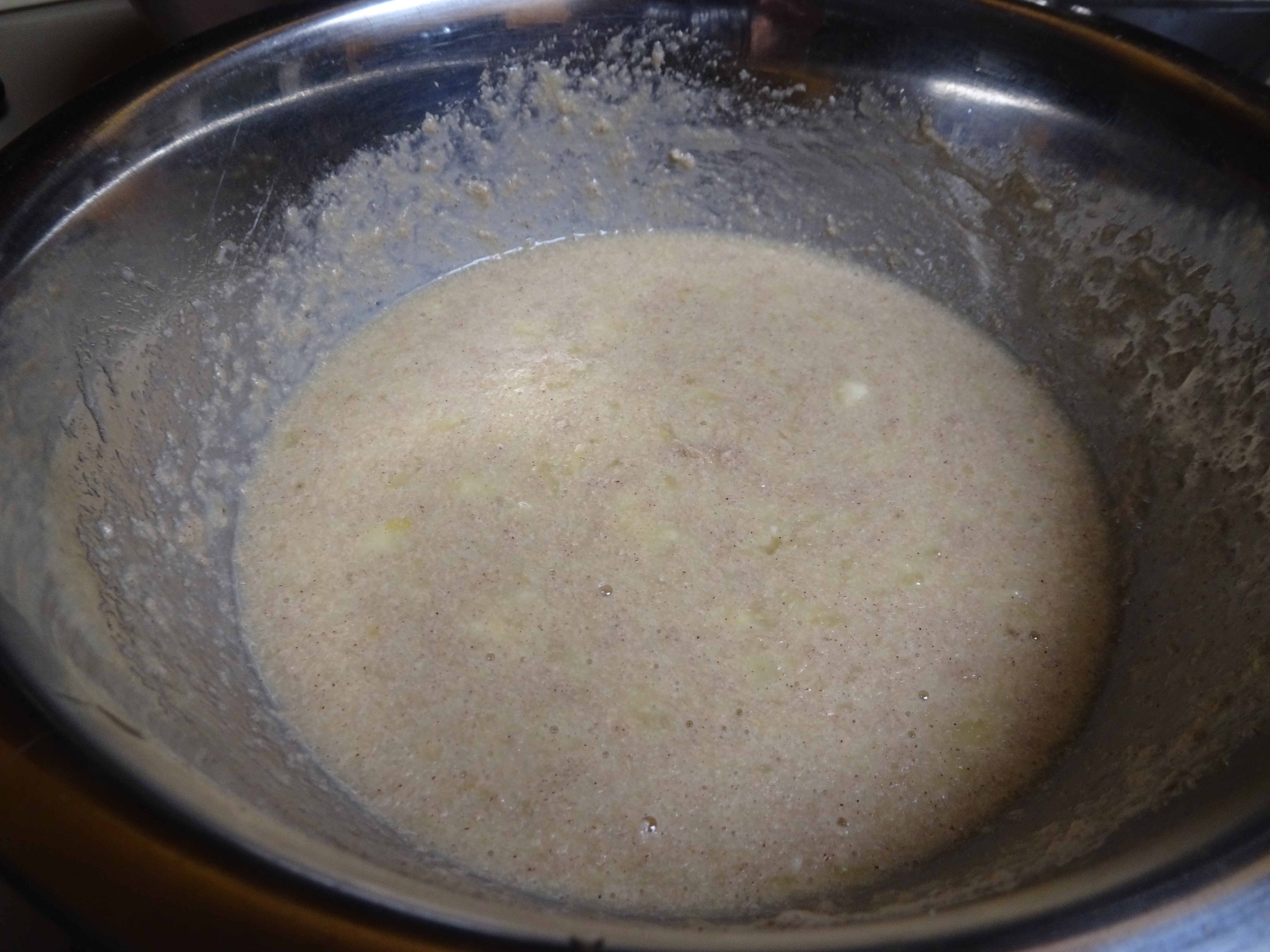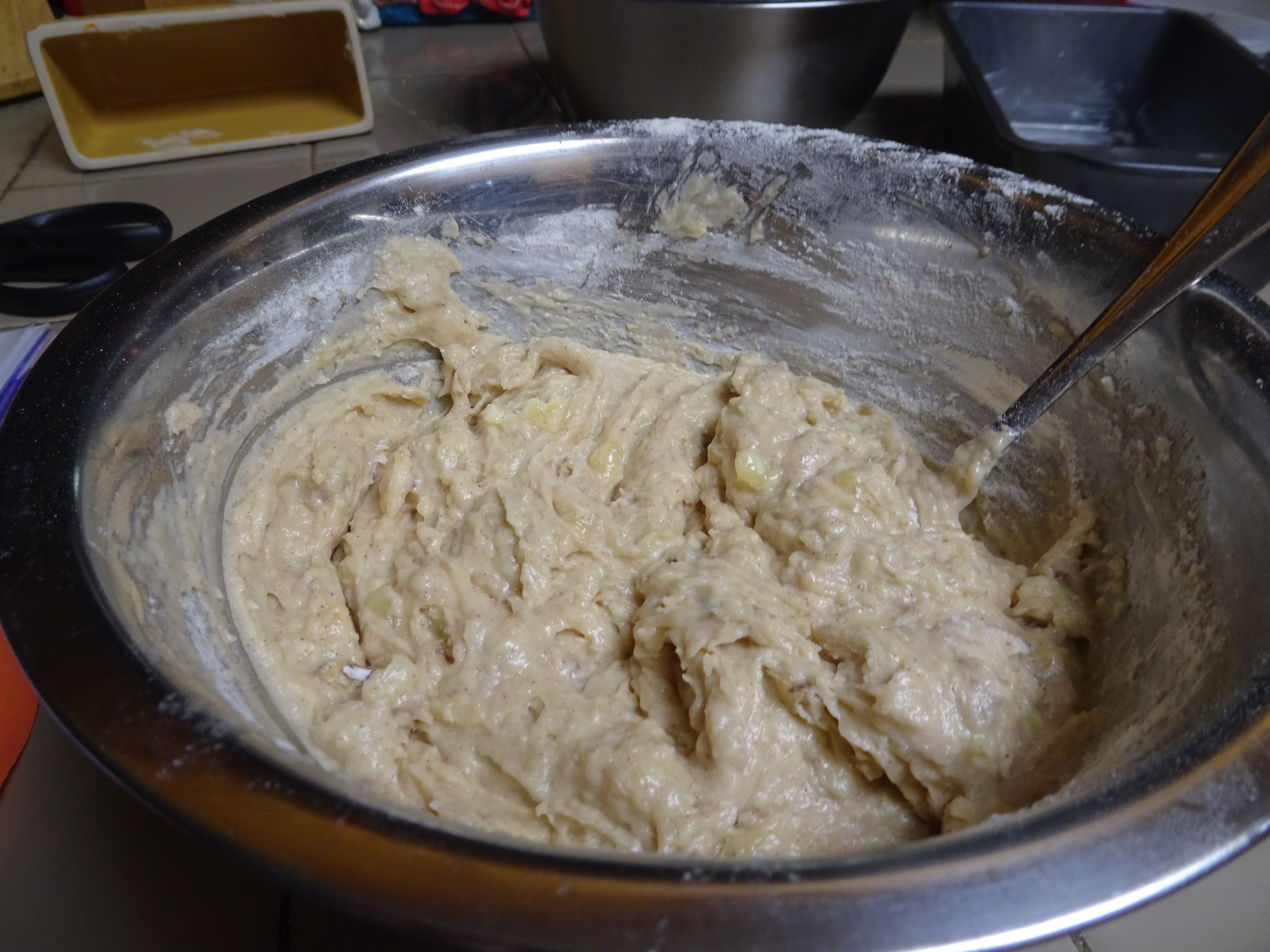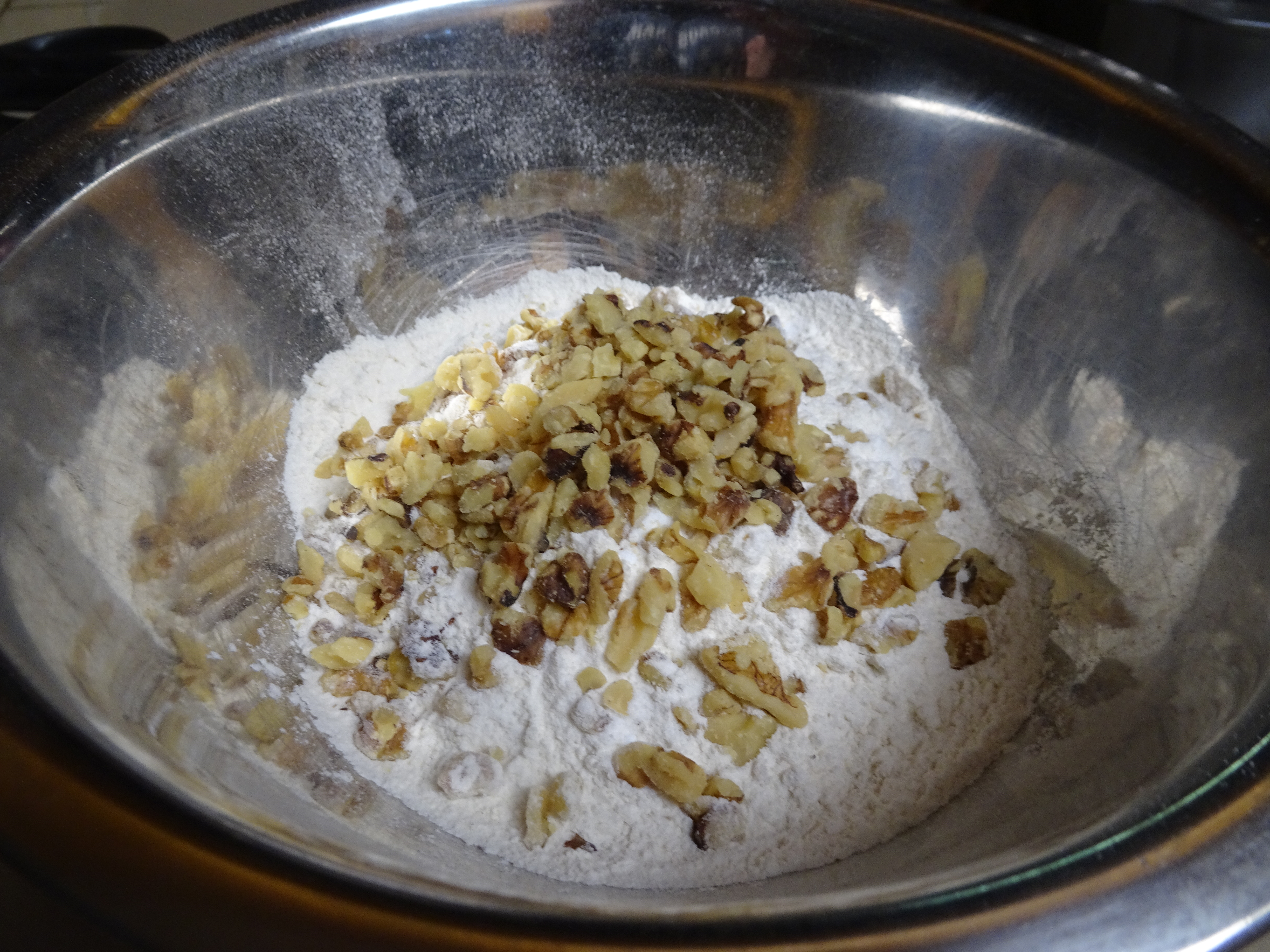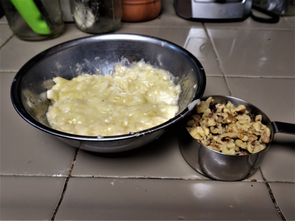 Chop walnuts, set aside. Peel and mash bananas, set aside. (I mashed one banana using a potato masher, the other using a fork to see which was best. The results were the same, but the fork was much easier.)