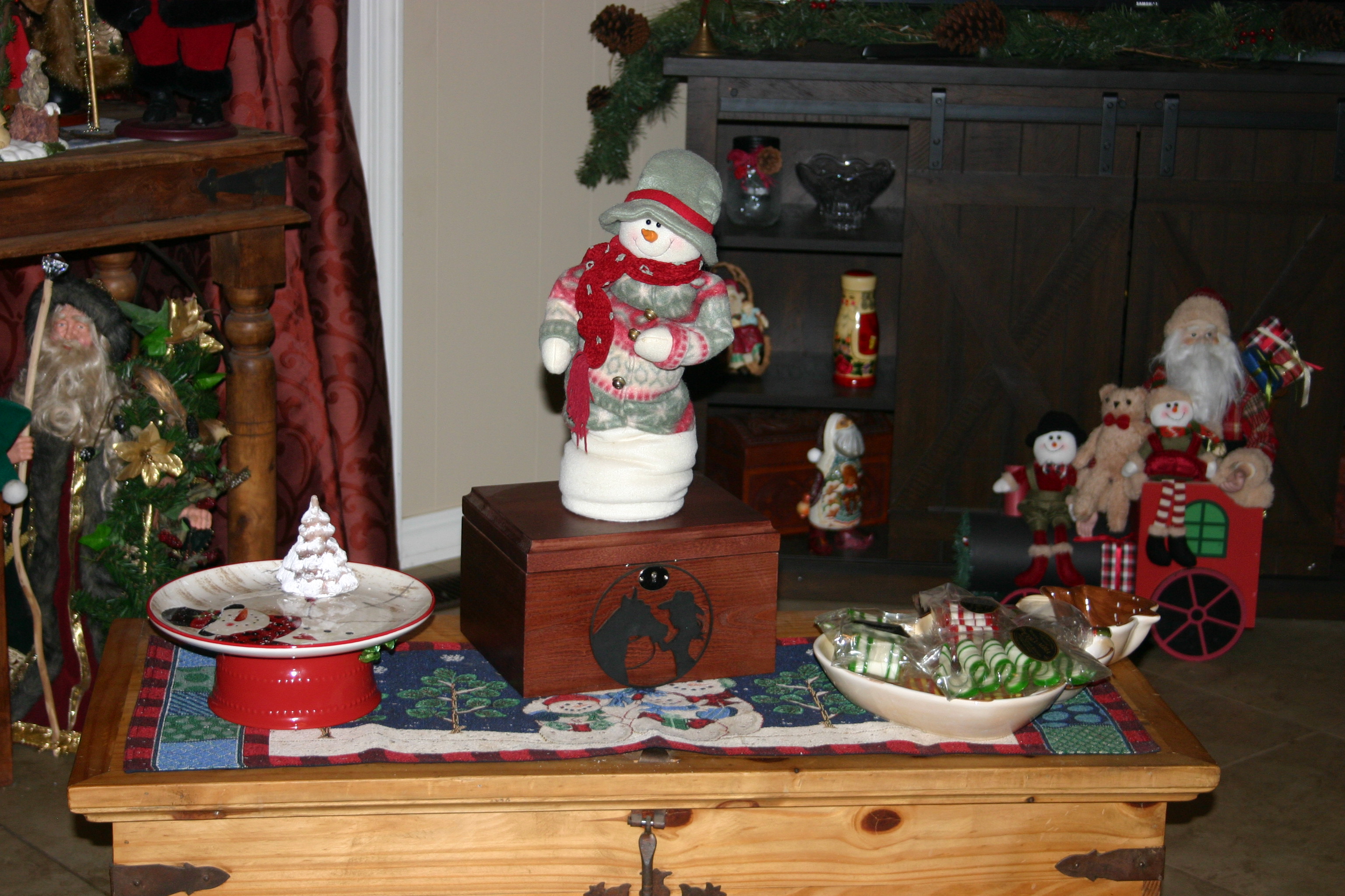 Nutcrackers are next in the obsession category at 50. You’ll find them hanging in the tree as ornaments, to wreaths and even a few unique ones mounted on horseback. Some are tiny, others are over 2 feet tall. Some day I hope to find the perfect pair – life size, made of wood. A collection of Snowmen is not far behind, with 47 and counting. Like the Santas, Snowmen can be found on just about everything from ornaments to snow globes and throw pillows. Snowmen are extra special. I have a snowman for each grandchild and great grandchild, hand picked the year they were born.