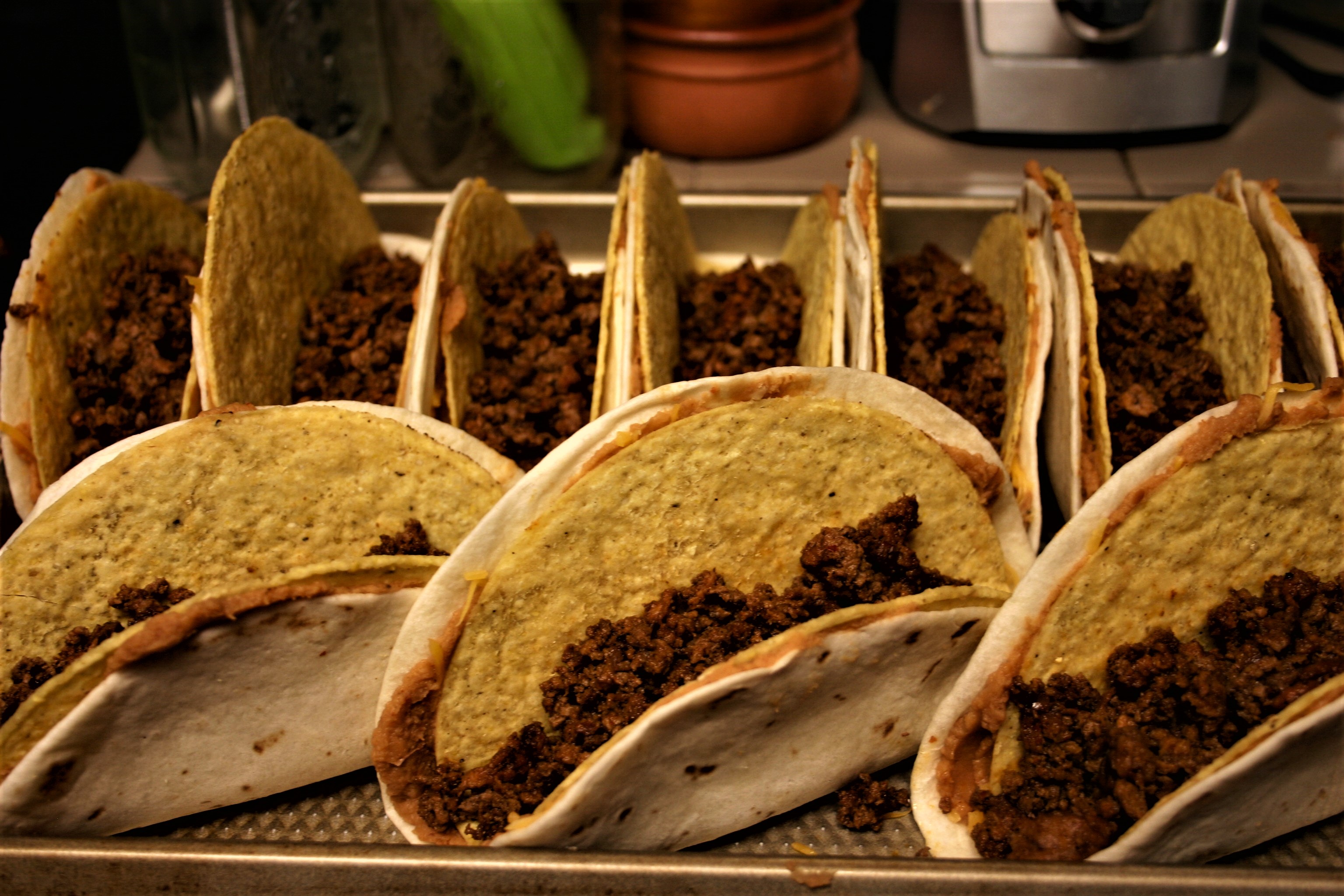 Remove tortillas and shells from the oven. Spread warm beans on a tortilla, then sprinkle with cheese. Stand taco shell in the center of the tortillas, gently press the tortilla onto the sides of the taco shell. Fill taco shell with beef and more cheese. Place on the baking sheet, repeat with remaining tortillas and shells.