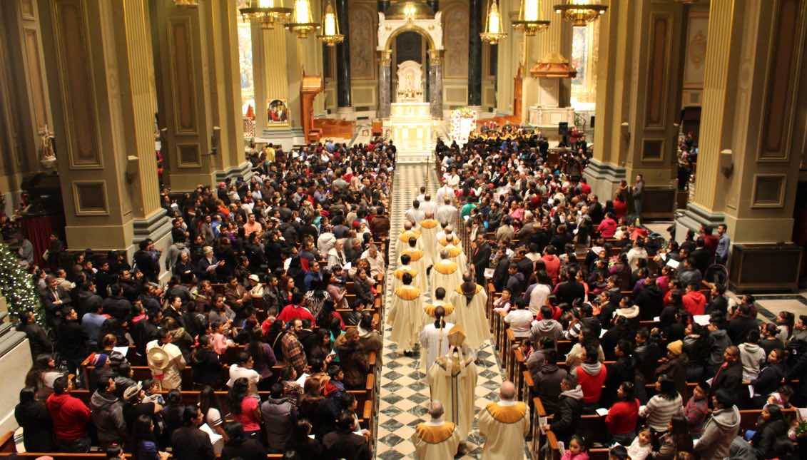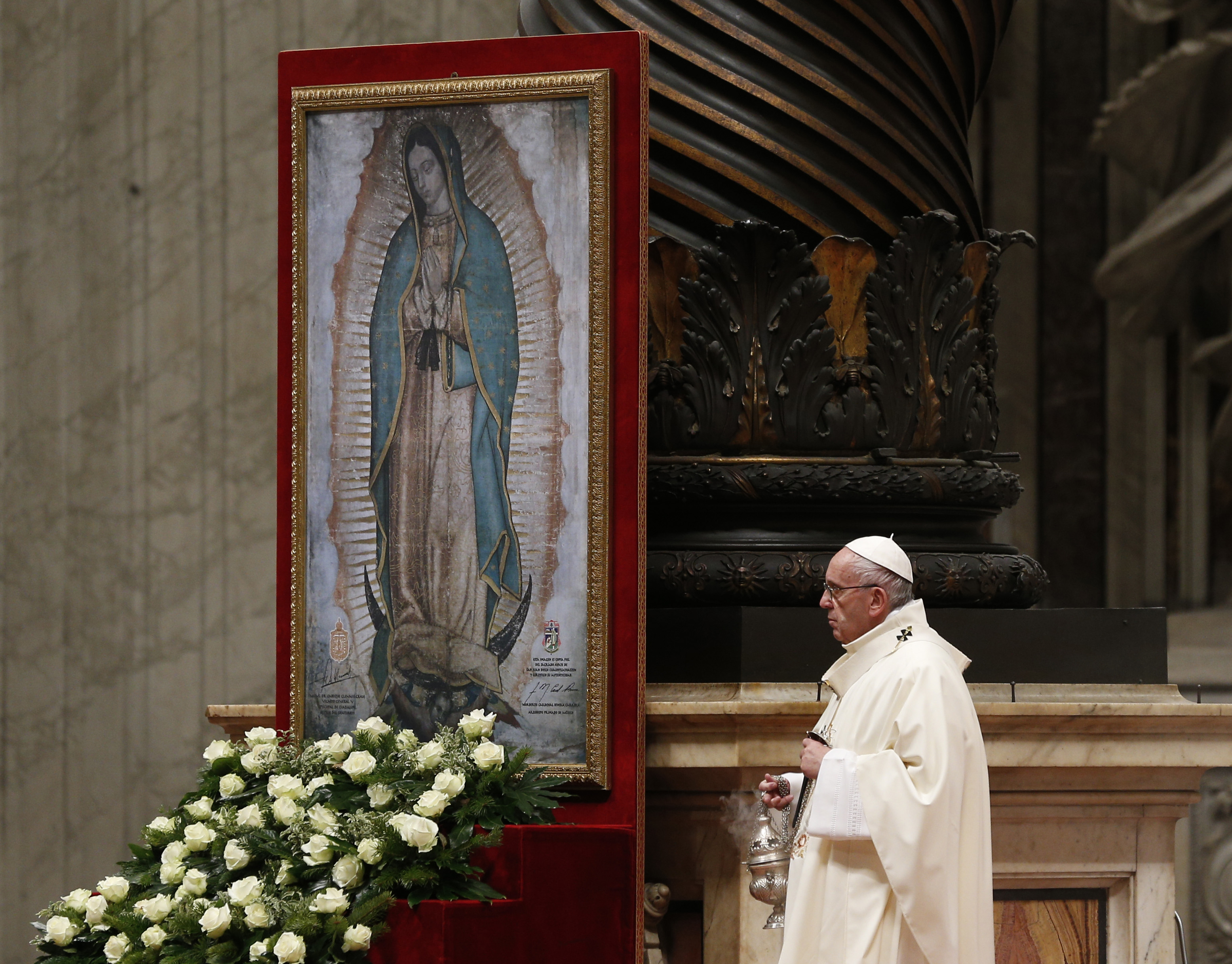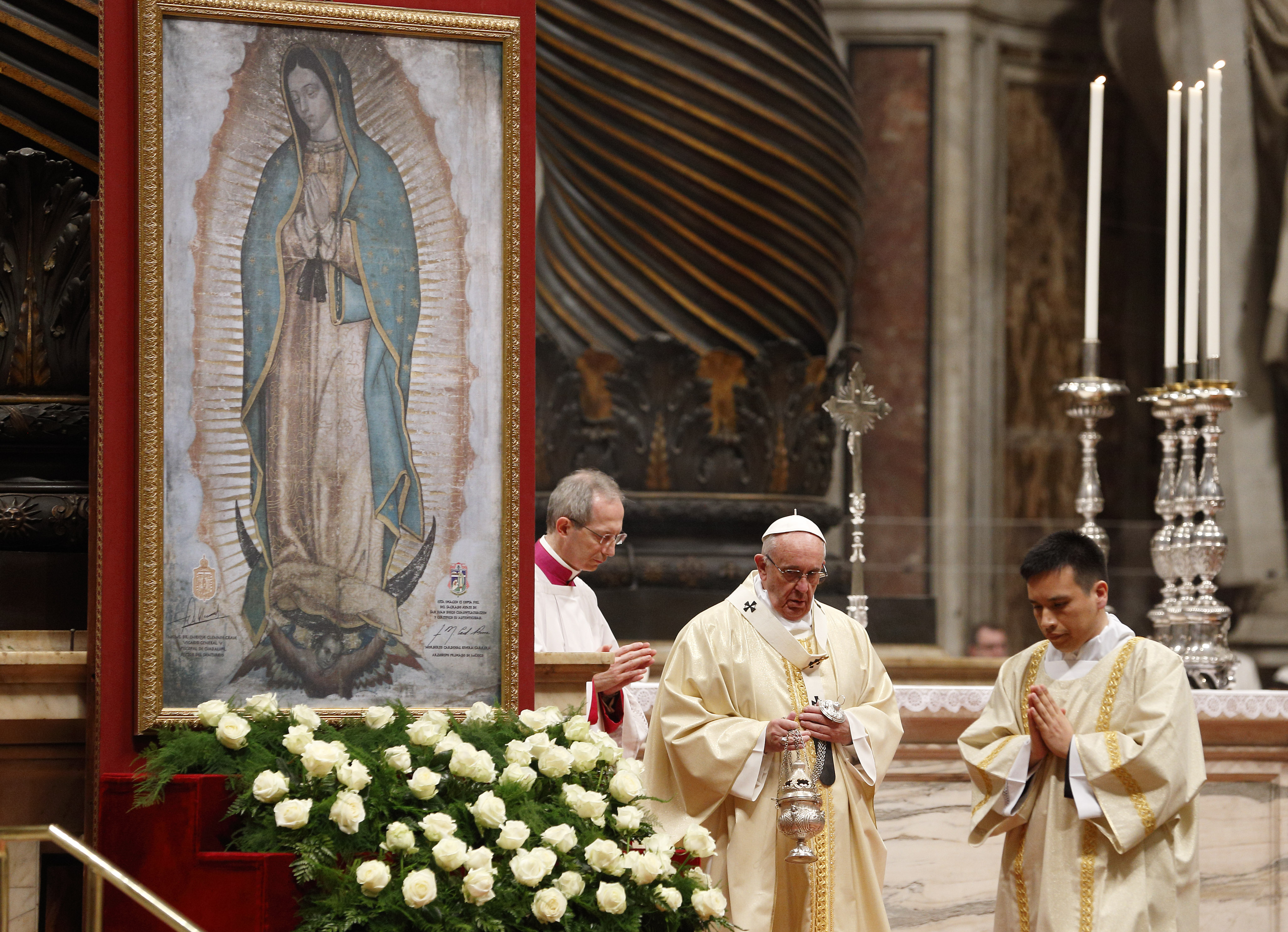 Juan gathered the flowers in his tilma (cloak) to bring to the Bishop. When he opened the tilma, not only were there flowers but the image we now recognize as Our Lady of Guadalupe. The Bishop ordered the shrine as requested. While the roses were a miracle, it was the image of our Lady that caused the Bishop and his advisors to fall to their knees in prayer. For she was the Mother of God, come to bring peace to a place that had seen much sorrow. The image was a pictograph that spoke to the Aztec people in ways the Bishop and the priests could not. Today faithful from all around the world make a pilgrimage to see Our Lady.