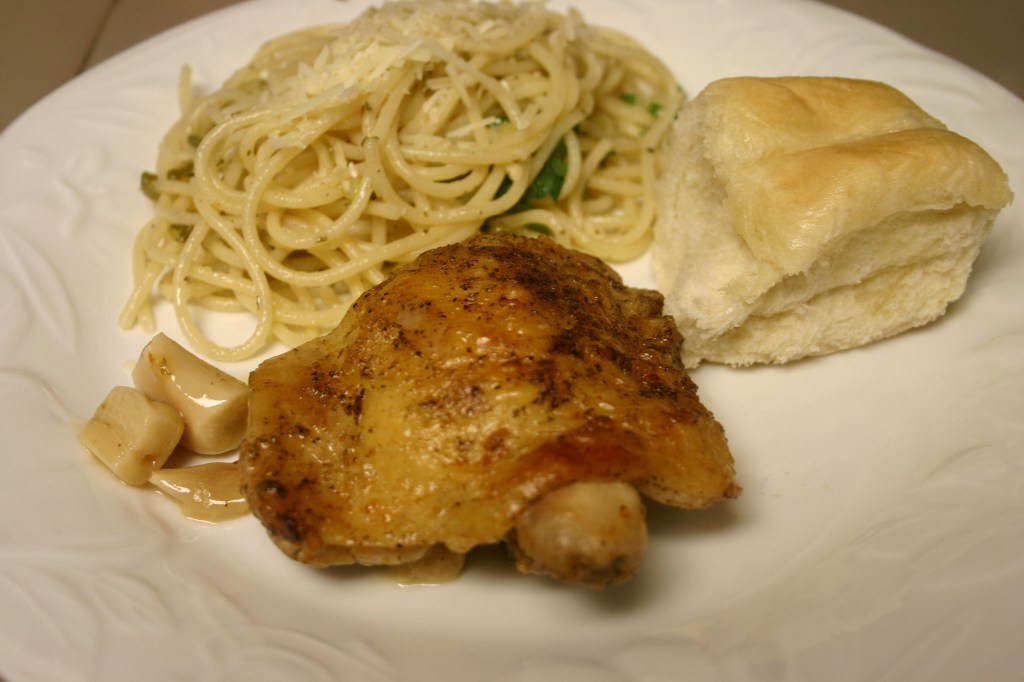 While the chicken browns, make the Spaghetti Bordelaise. Serve chicken thighs with a nice side of flavorful spaghetti.