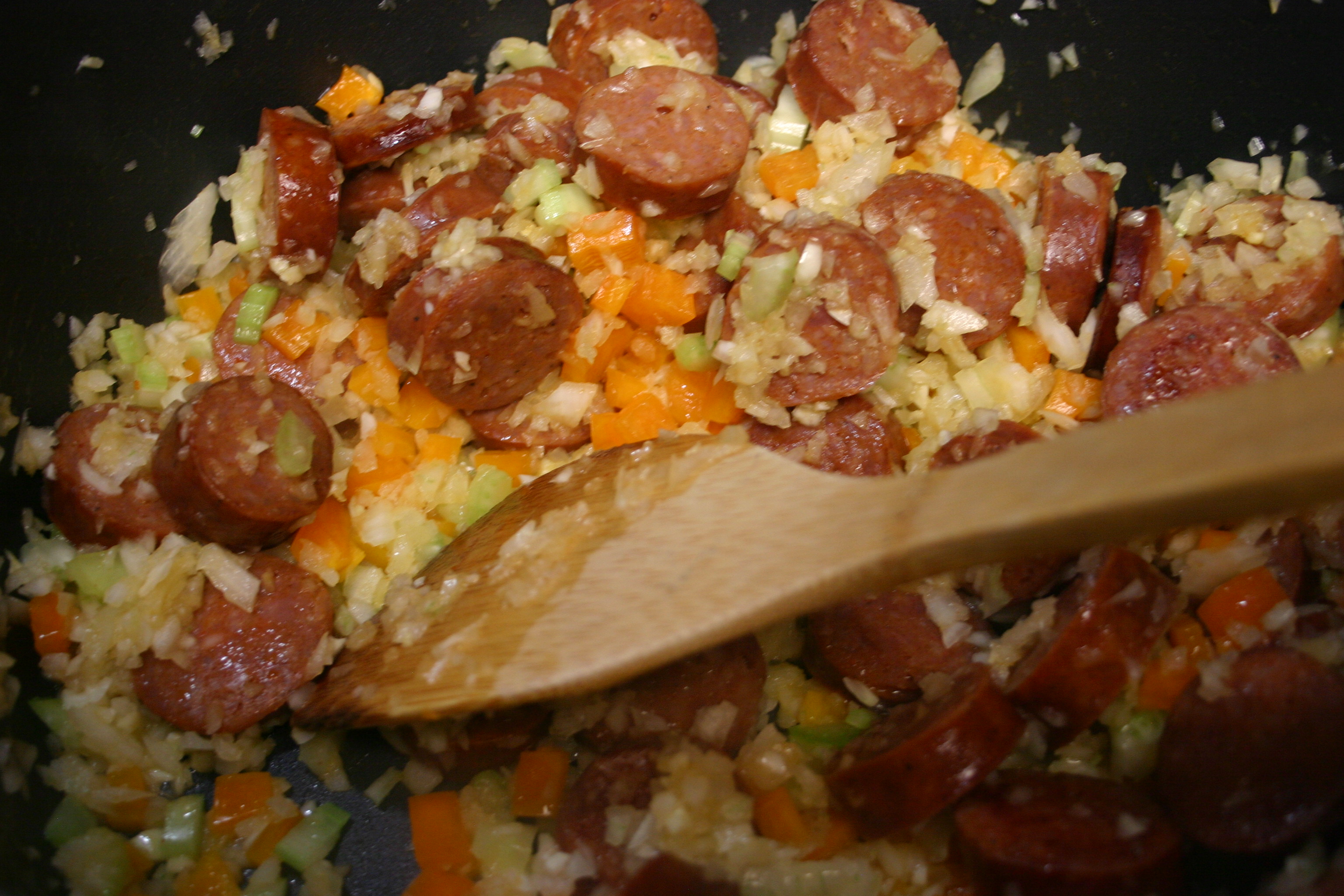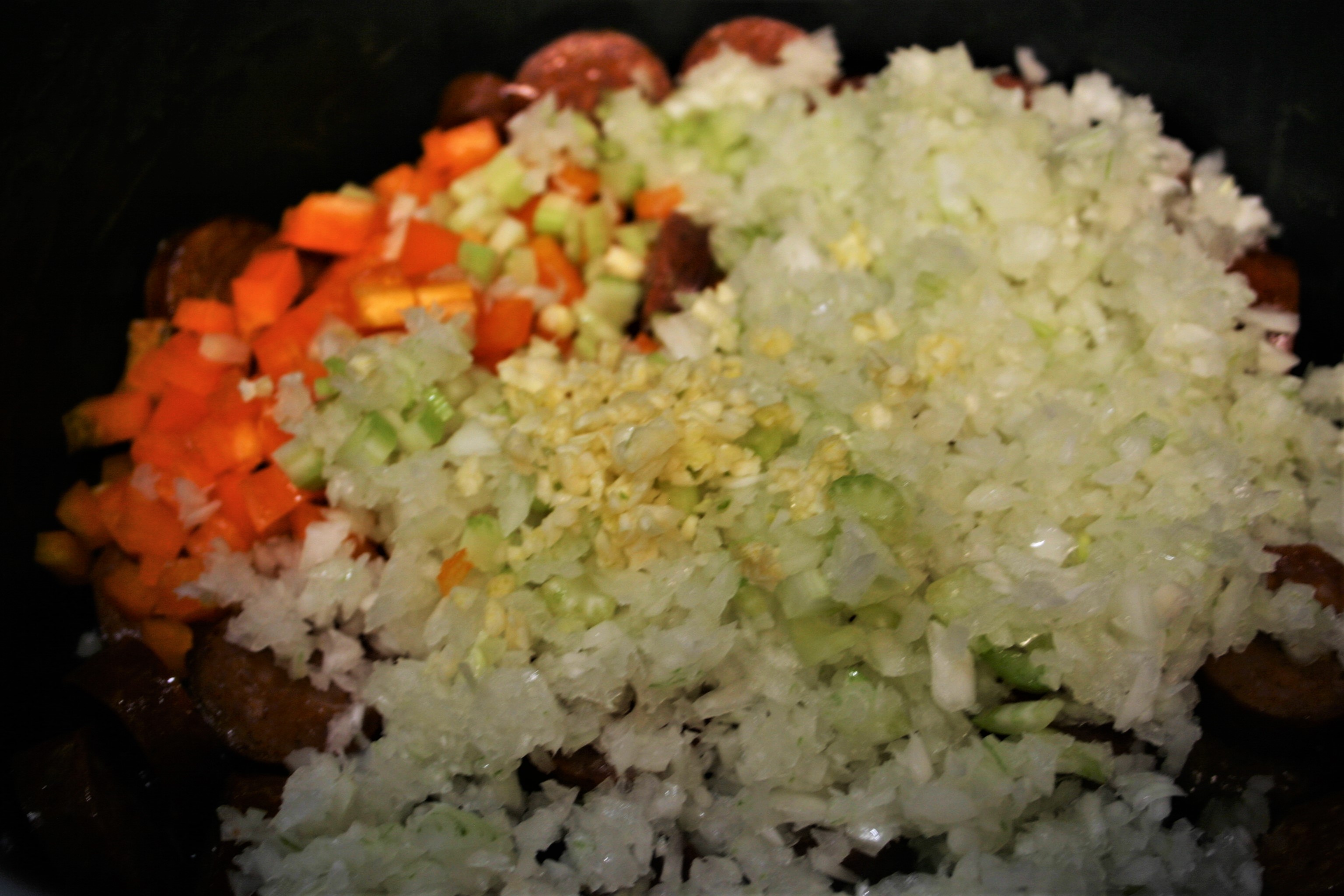 Slice sausage into coin-cut pieces, set aside. Clean and chop celery, set aside. Peel and mince onion, set aside. Core, seed and finely chop bell pepper, set aside. Peel and mince garlic, set aside. chop fresh thyme, oregano and basil, set aside.