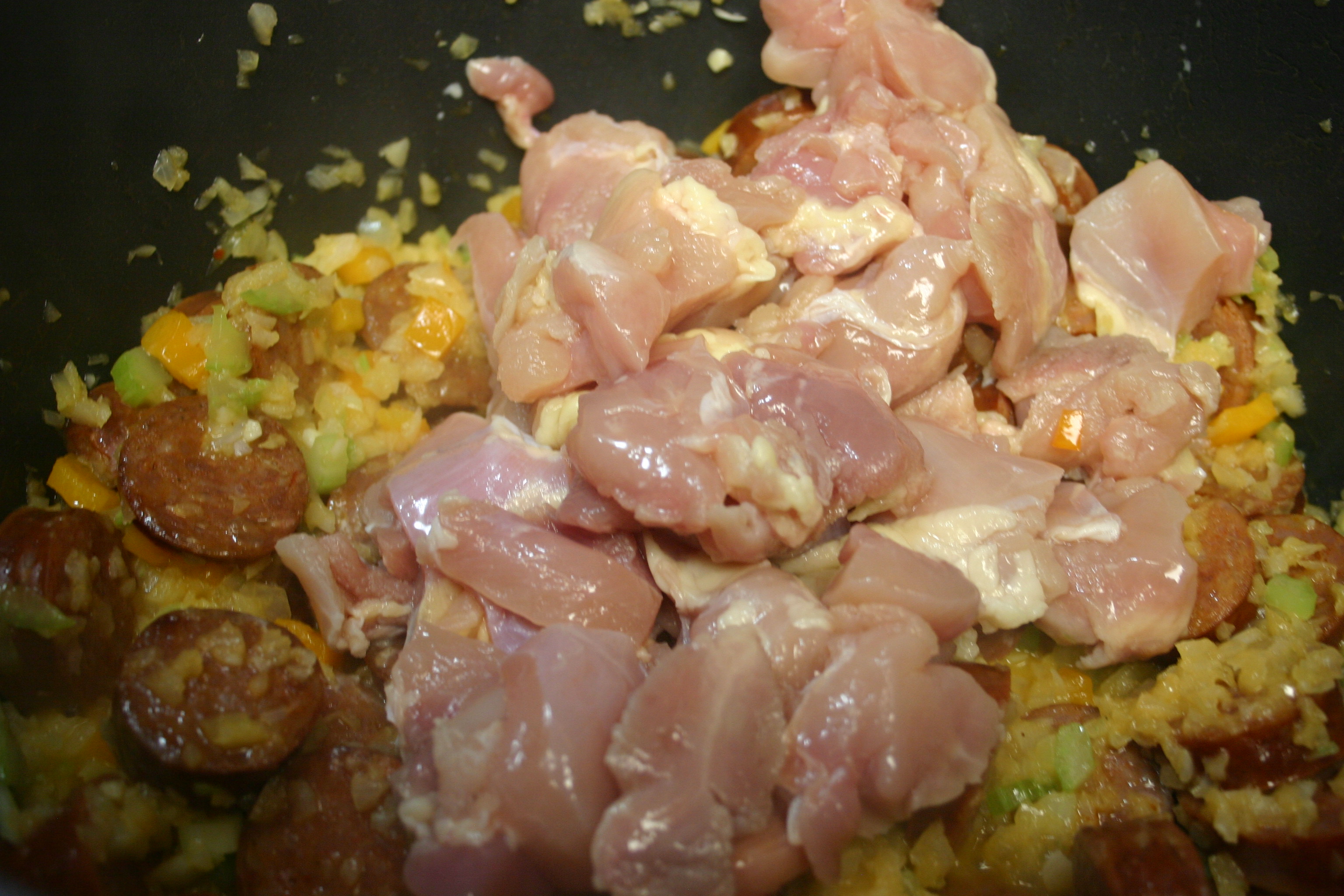 Cut boneless chicken thighs into bite-side pieces, set aside. Peel and devein shrimp, remove tail. Keep shrimp chilled until ready to cook.