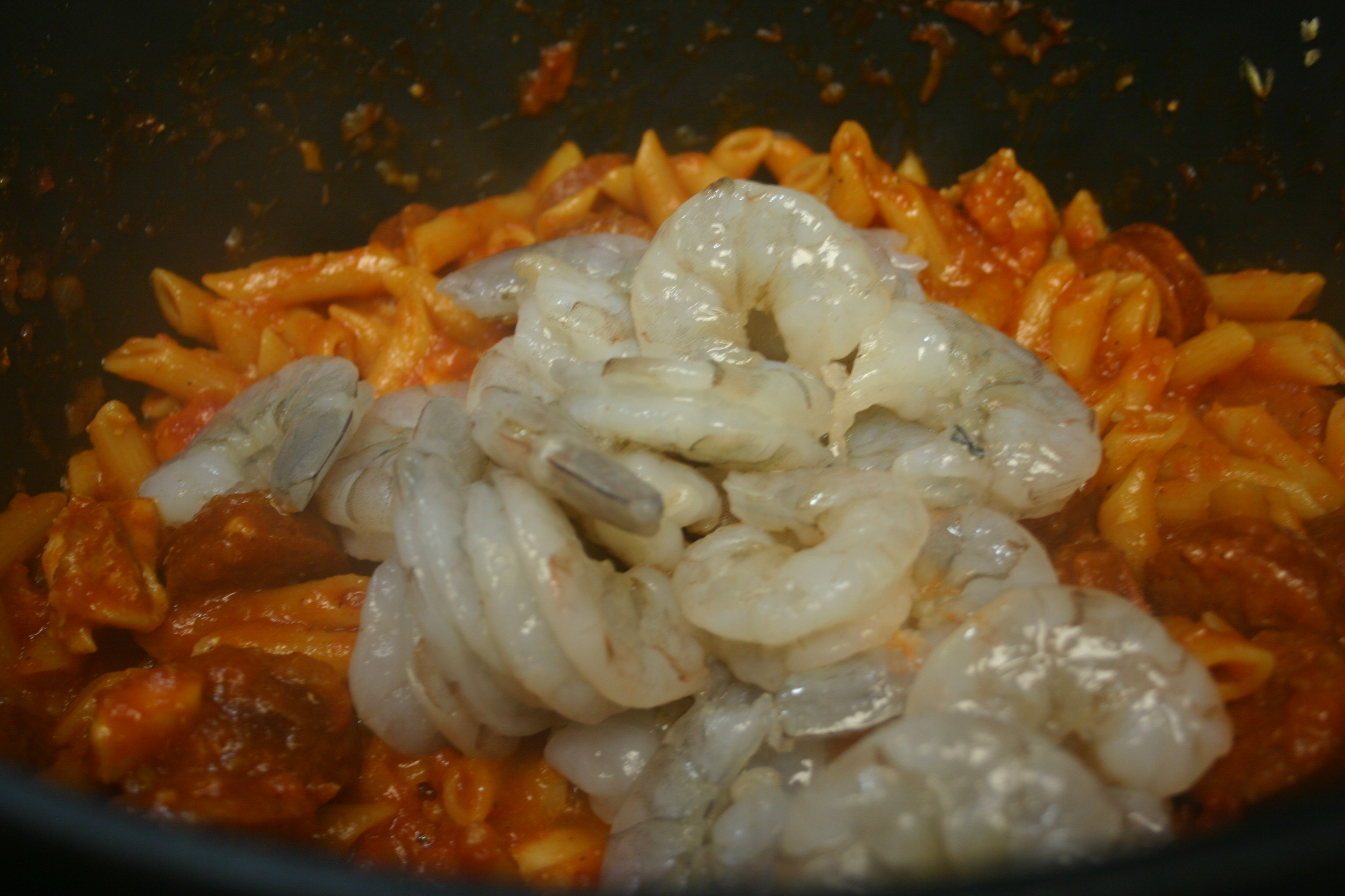 Add chicken stock to the pot and return to a simmer. Add penne, simmer for 8 minutes, until almost cooked through. Add shrimp. Continue to simmer, stirring constantly, until pasta is tender but firm to the bite and shrimp are cooked through, about 20 minutes more, stirring as needed to prevent scorching.