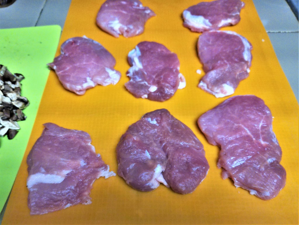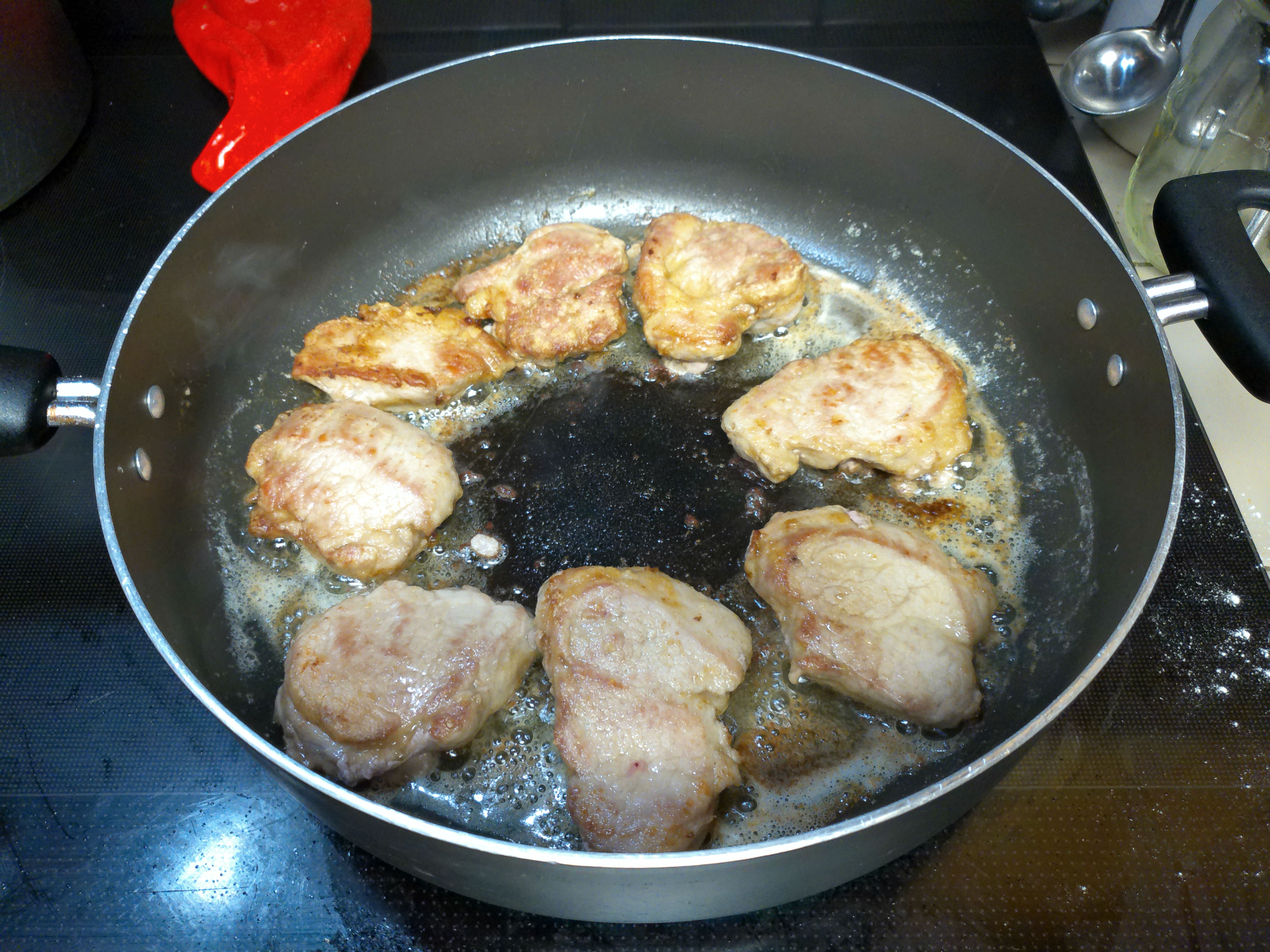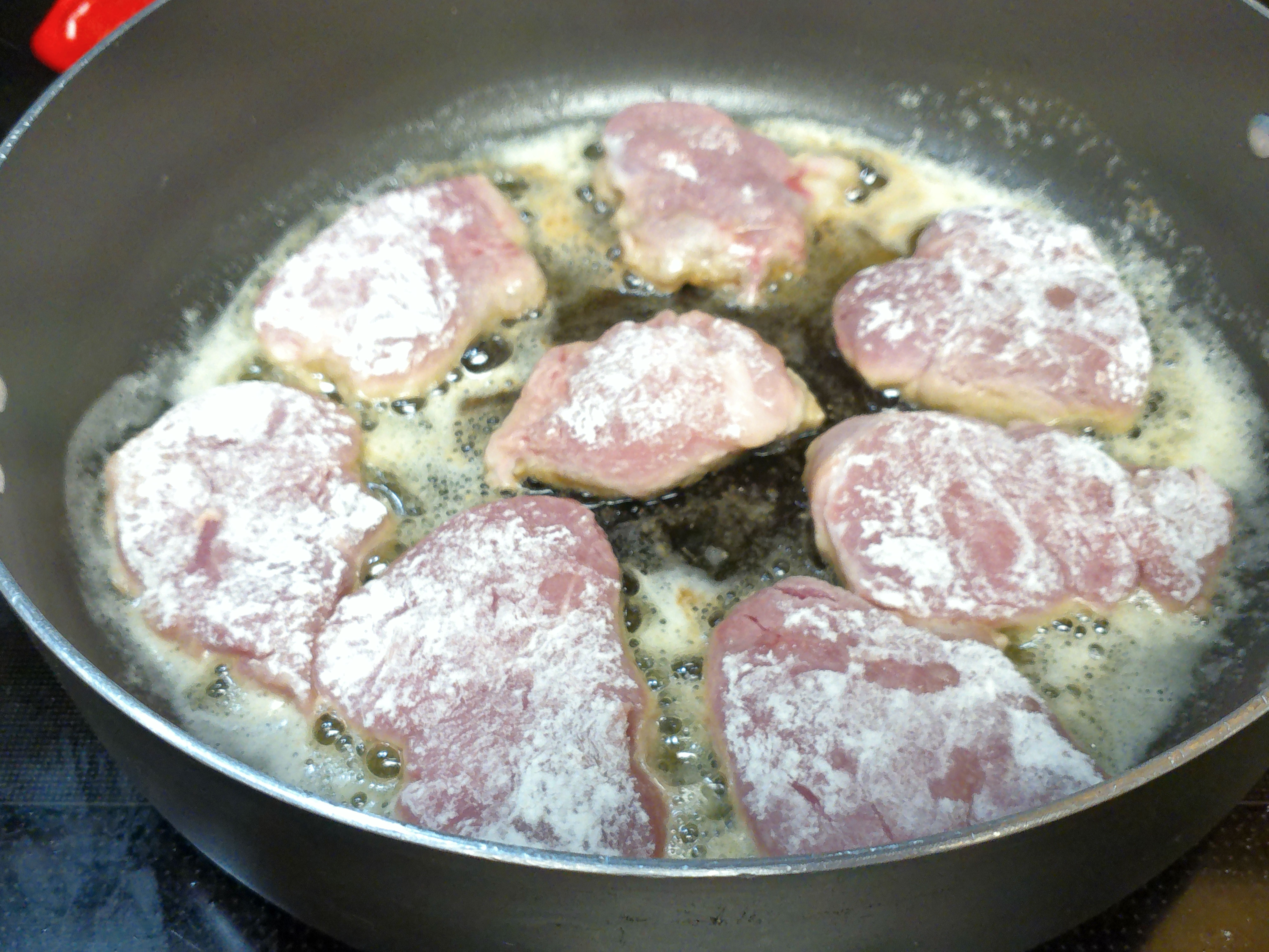 Flatten pork slices to 1/4-inch thickness. Place flour in a large shallow dish. Add pork, a few pieces at a time, and turn to coat.
