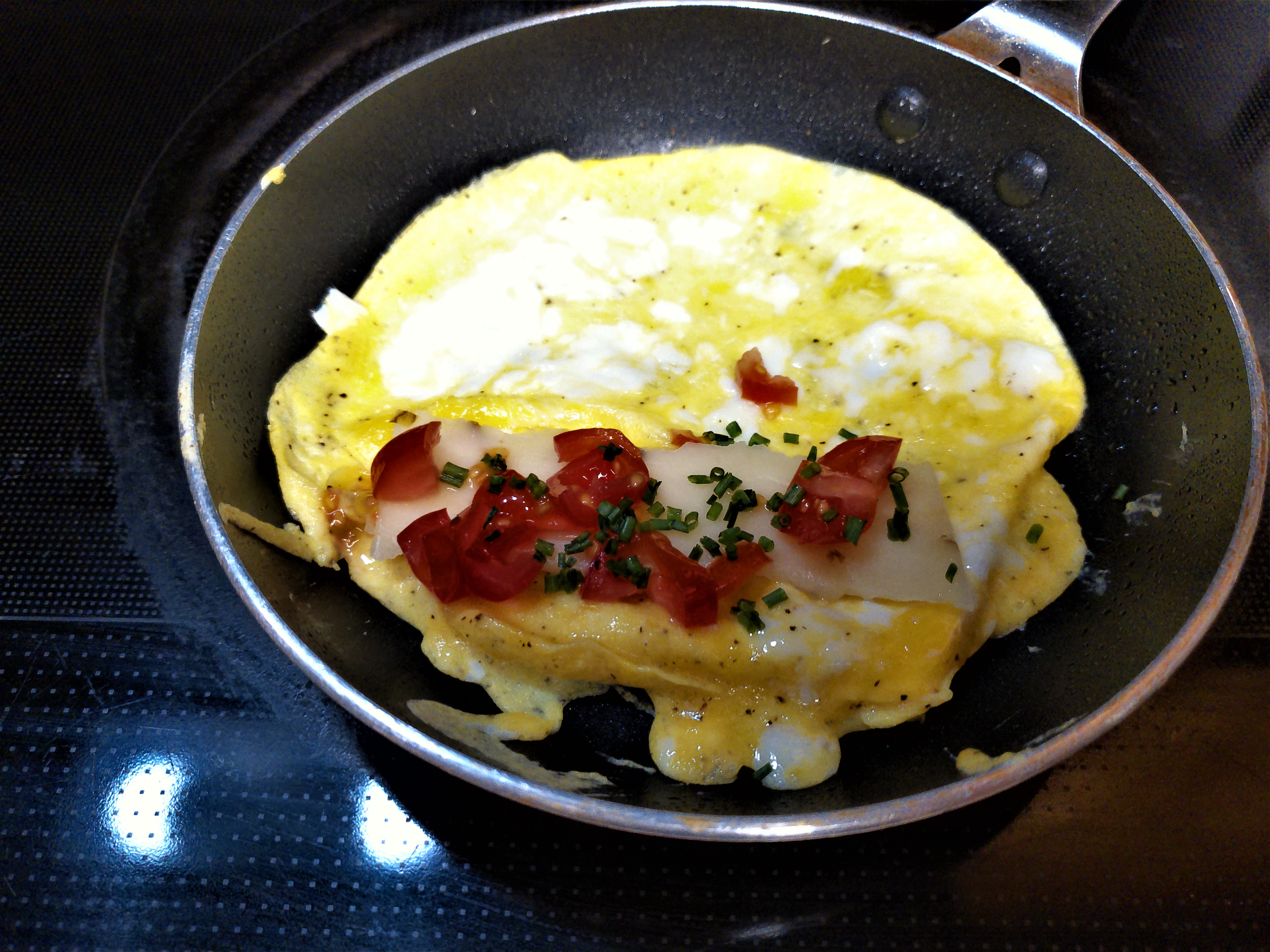 Remove from heat. Lay cheese on one side of the omelette. Scatter tomatoes and chives over the cheese. Fold unfilled half over the filling. Let rest in the skillet for just a minute or two for the cheese to melt.