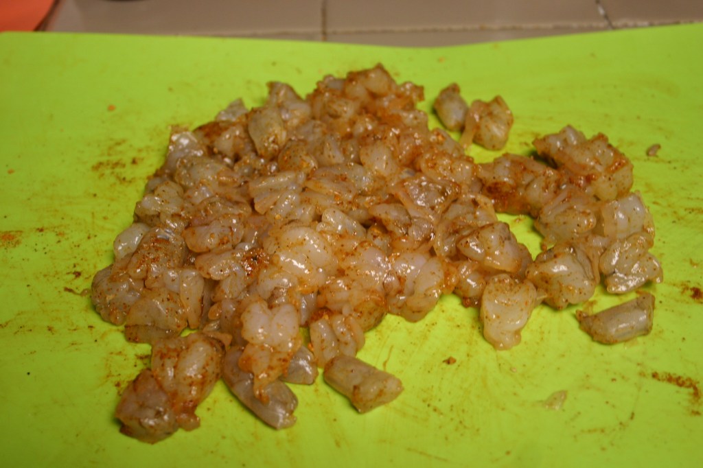 Clean, peel and devein shrimp. Remove and discard tails. Dice shrimp, season with taco seasoning, toss to coat. Keep shrimp chilled until ready to cook.