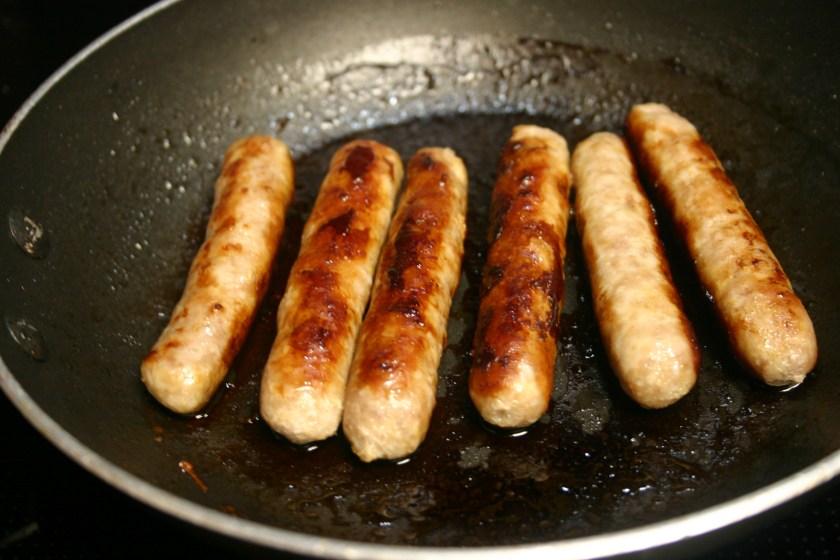 Place sausage links in a small skillet. Add about 1/4 cup of water. Place skillet over medium-high heat, cover and let cook until most of the water has evaporated and the sausage is steam-cooked. Remove lid, let sausage links brown, turning as necessary. Keep warm until ready to use.