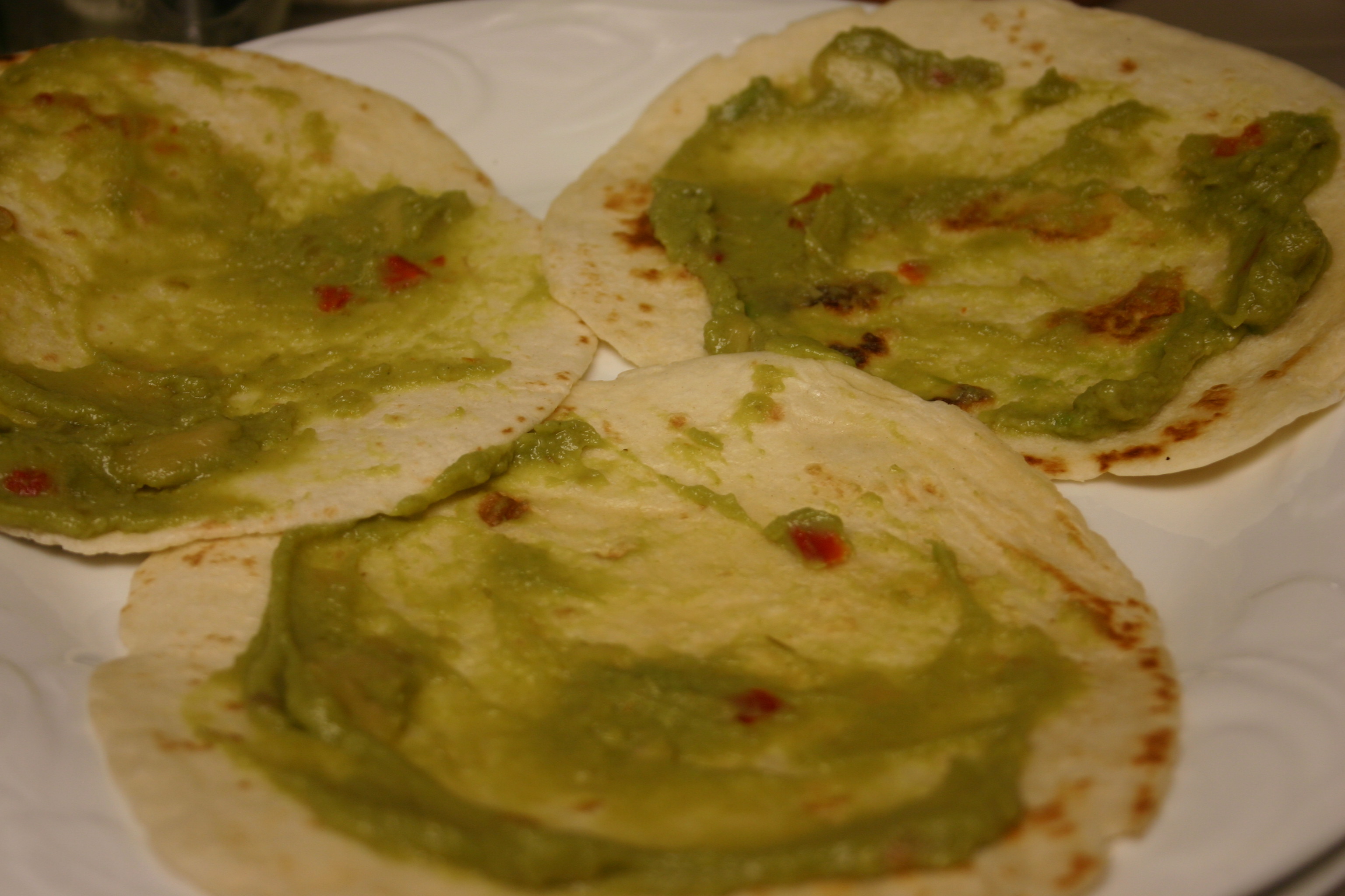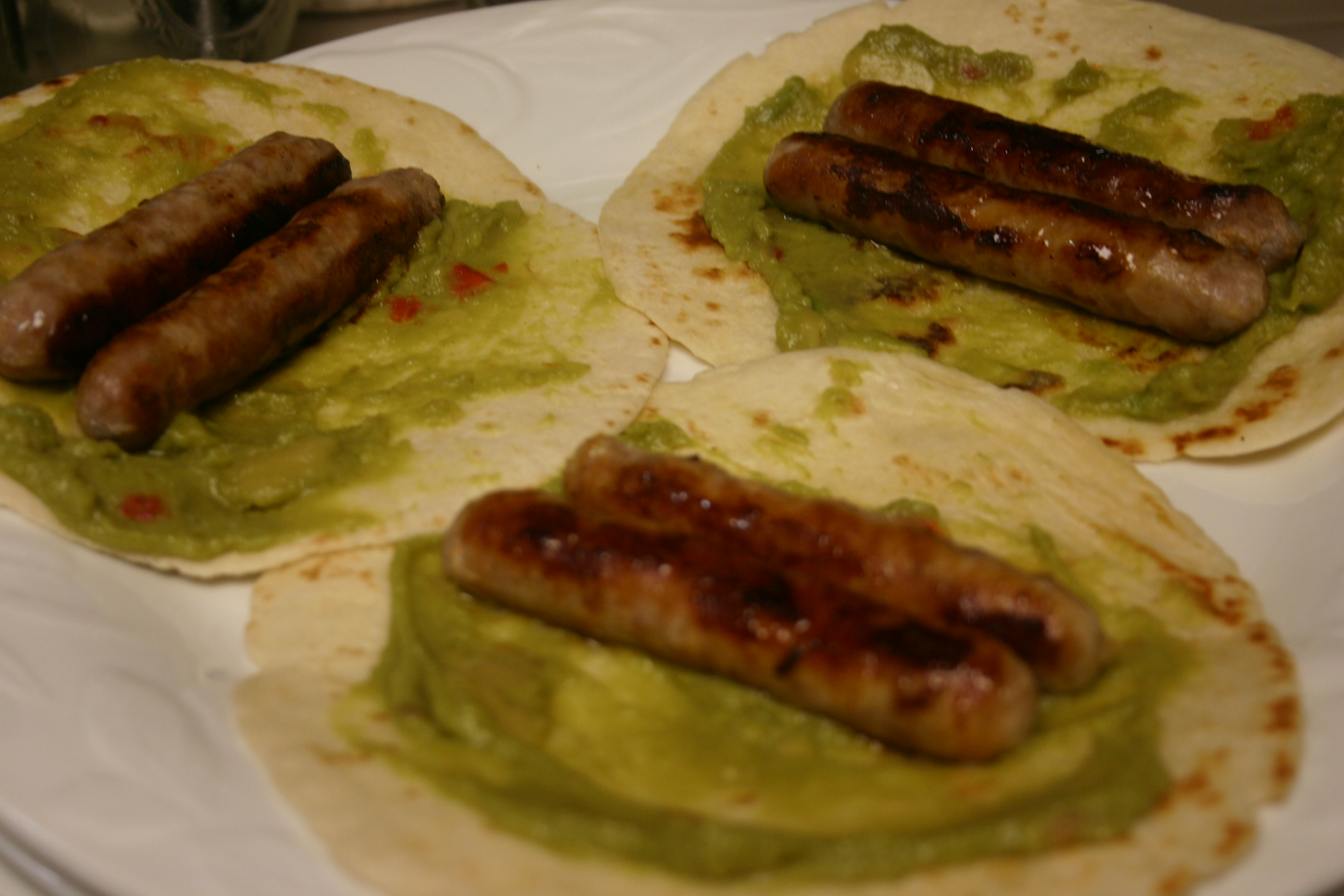 Spread a tablespoon of guacamole on each tortilla. Lay 2 sausage links in the center of each tortilla. Top with eggs and cheese.
