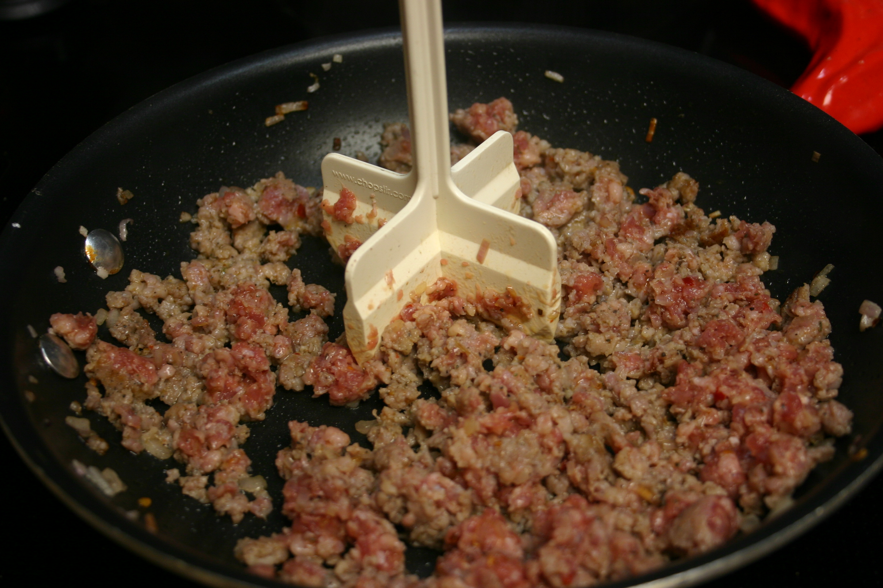 Add minced shallots to the skillet. Crumble sausage, add to the pan. Cook, breaking apart into small pieces, until sausage is no longer pink. Keep warm until ready to use.