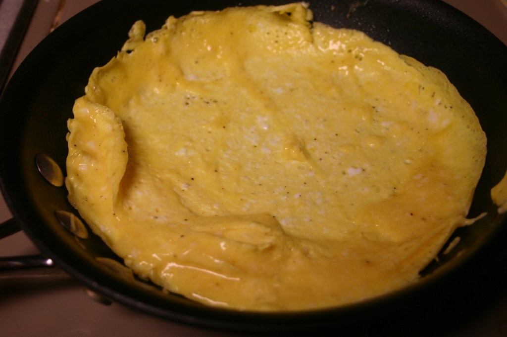 Pour whipped eggs into the pan, swirl to spread out evenly. Season with salt and pepper. Cook, shaking the pan, while the egg sets. Push cooked egg toward the center, letting the uncooked egg run below. Continue to swirl, push and cook until egg has completely set. If bottom is beginning to brown, remove from heat and allow residual heat continue to cook the egg.