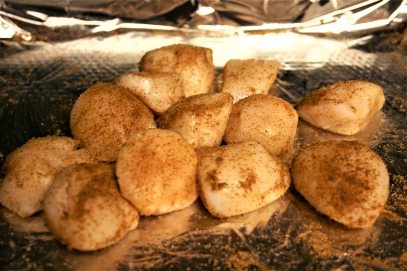 Place seasoned scallops in the hot skillet, let blacken 2 or 3 minutes undisturbed. Turn scallops once, let cook about 1 minute longer.