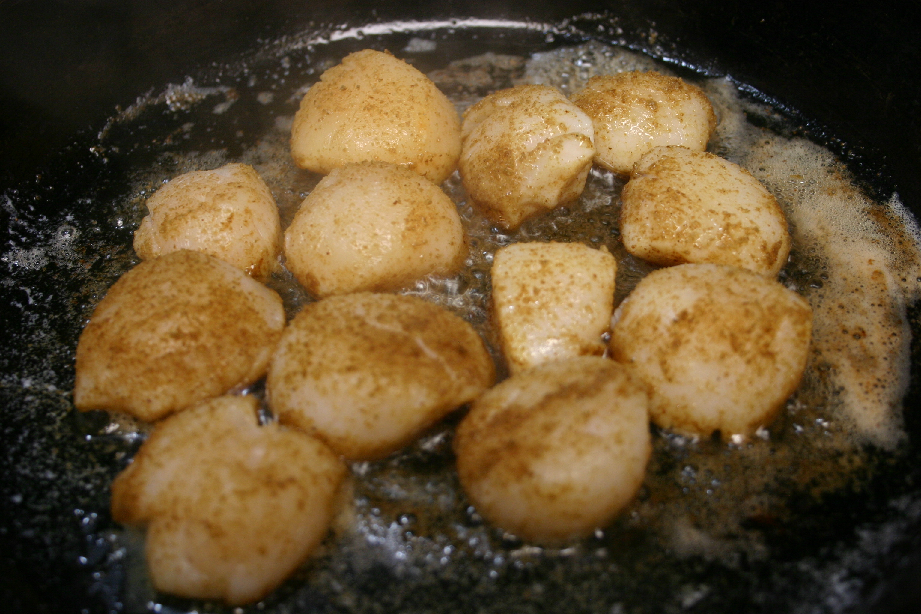 Pat scallops dry. Season to taste with cumin. Set aside.