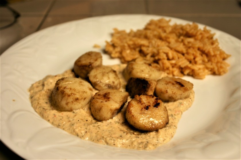 Spread sauce out on individual plates. Divide scallops between the plates, serve and enjoy.