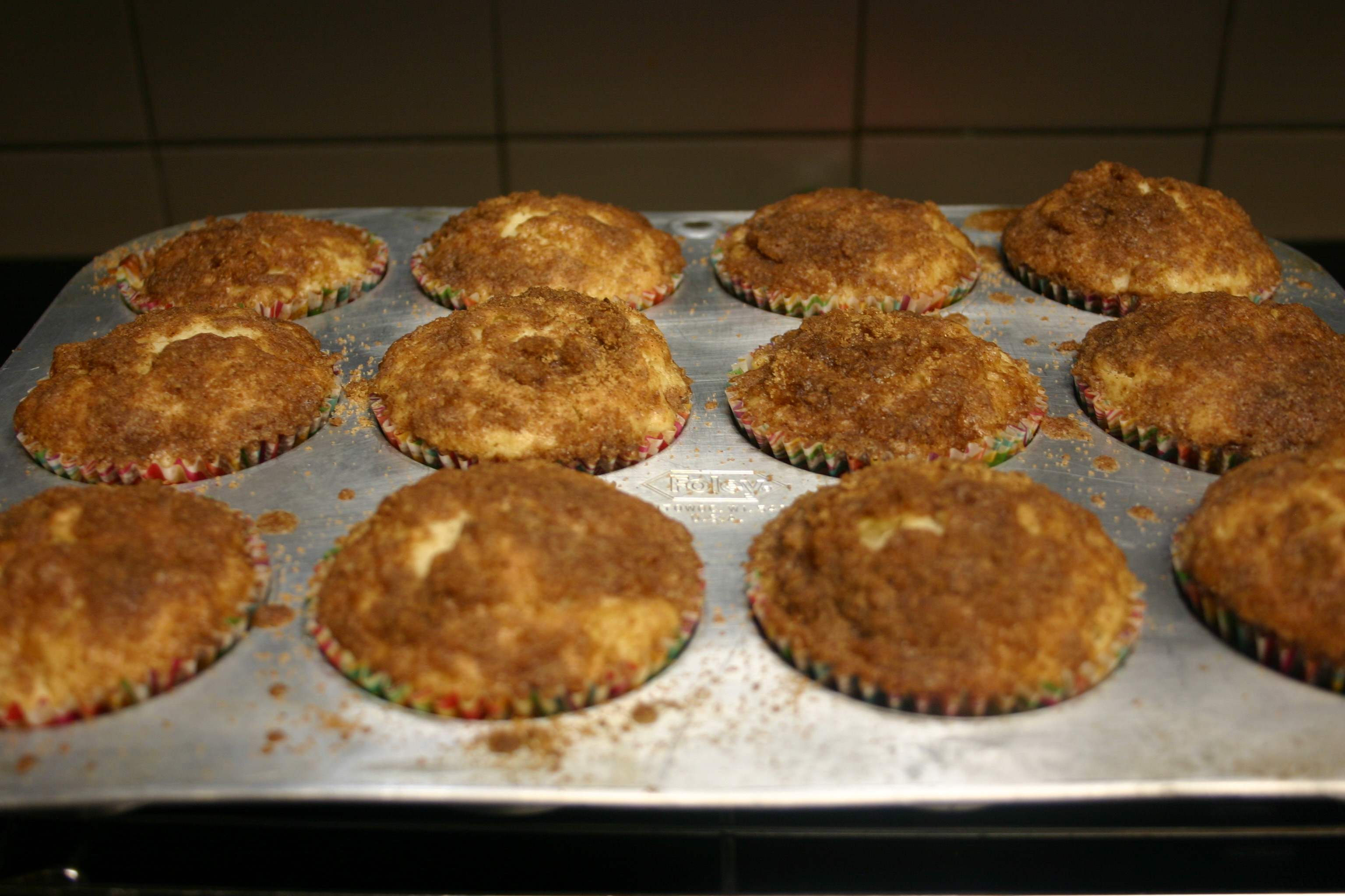 Spoon about a tablespoon of batter into each prepared muffin tin. Sprinkle about a teaspoon of the brown sugar mixture over each muffin. Bake in heated oven until golden brown, about 20 minutes or so.