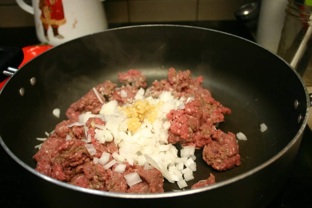 In a large skillet over medium-high heat, cook beef, onions and minced garlic until beef is browned, about 7 minutes. Stir occasionally, breaking meat into small pieces as it cooks. Drain well. Return browned meat to the skillet.