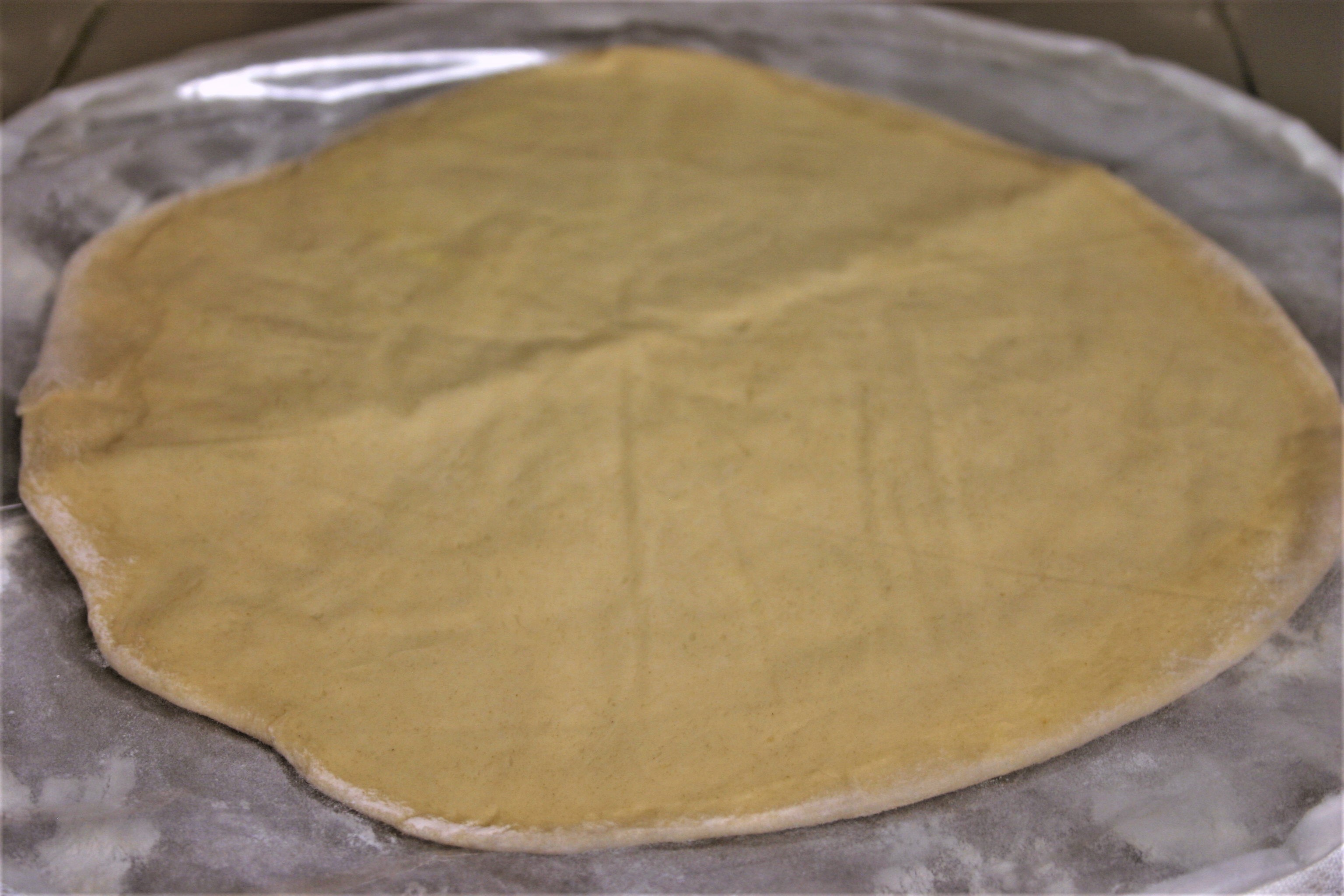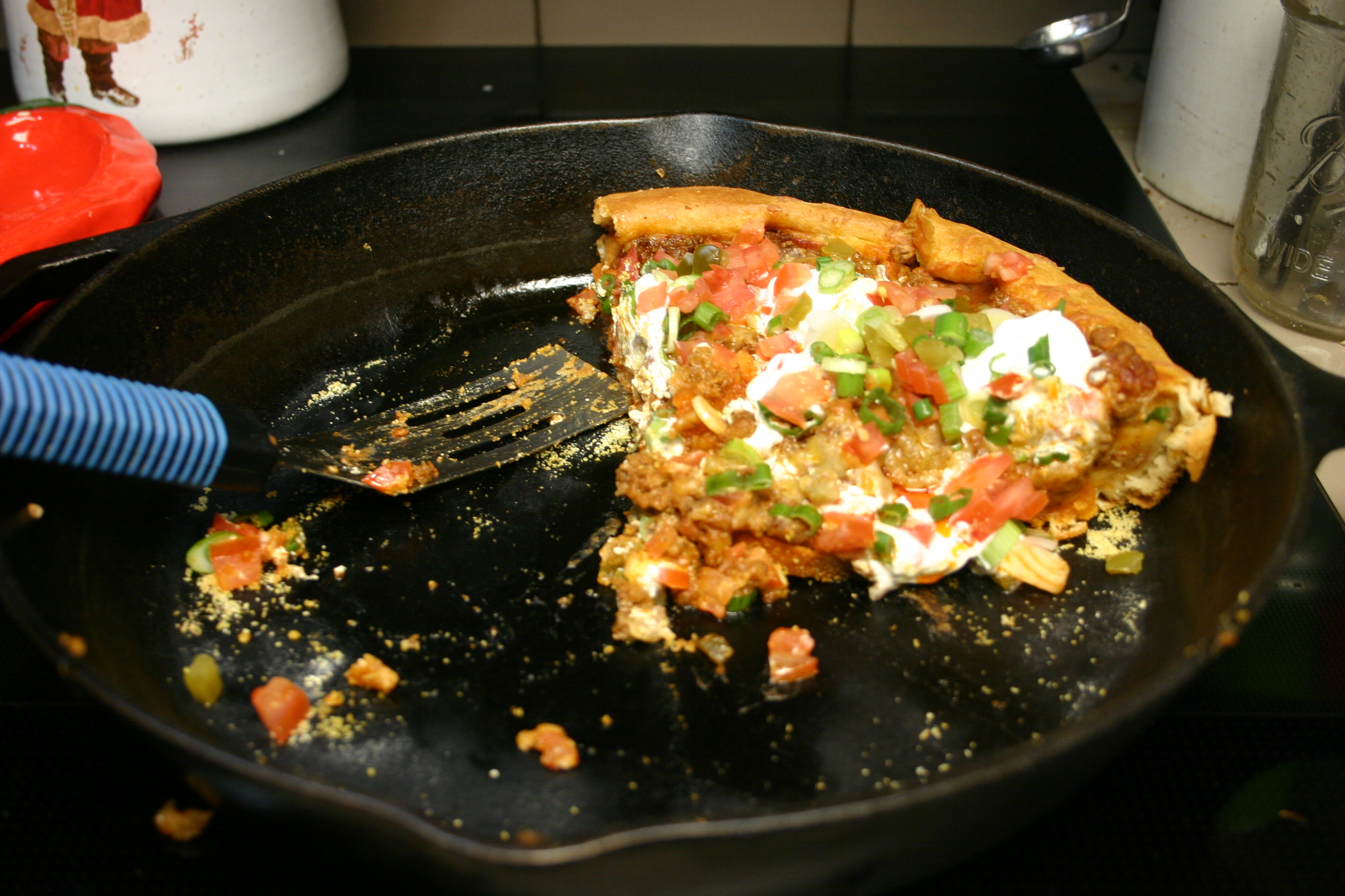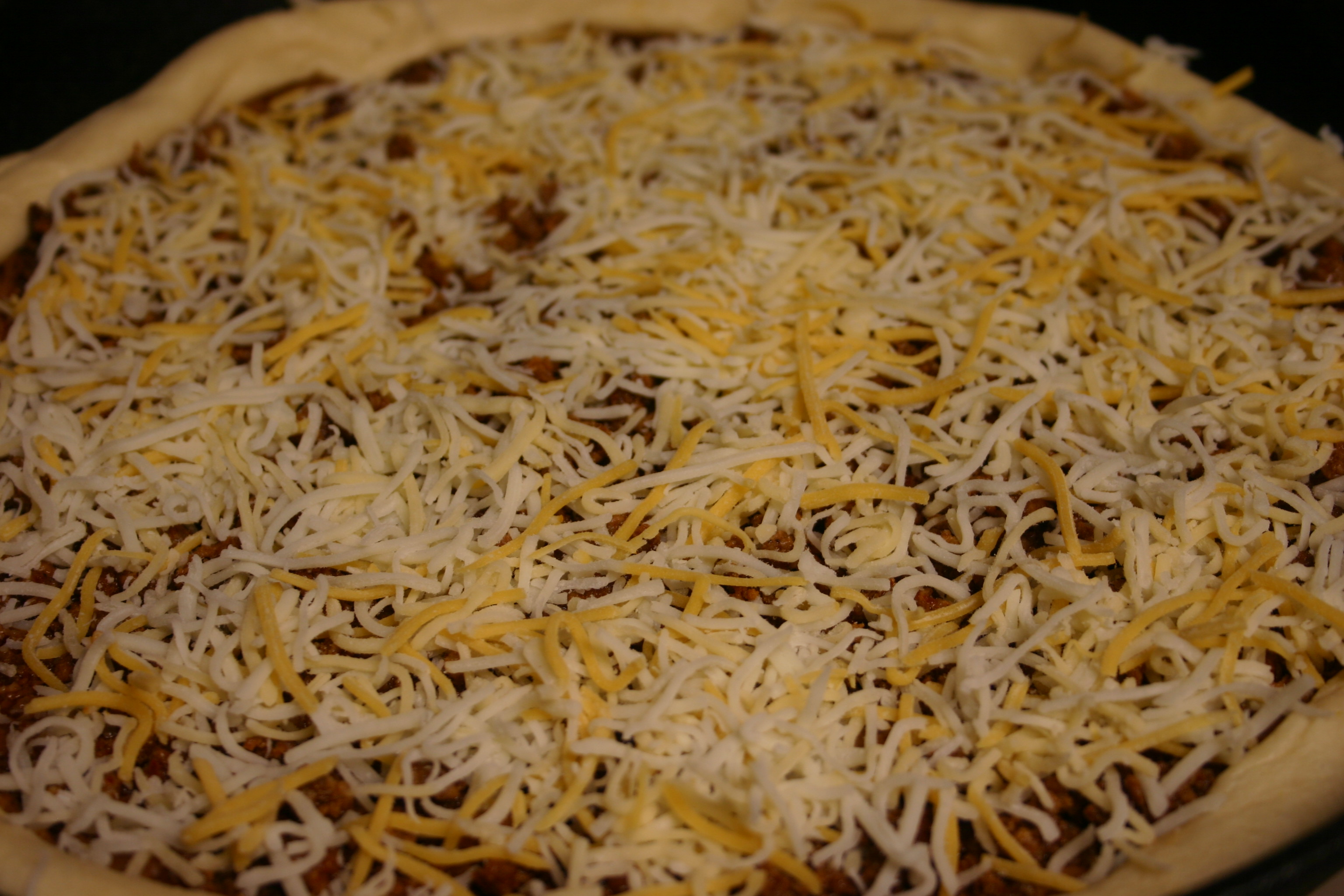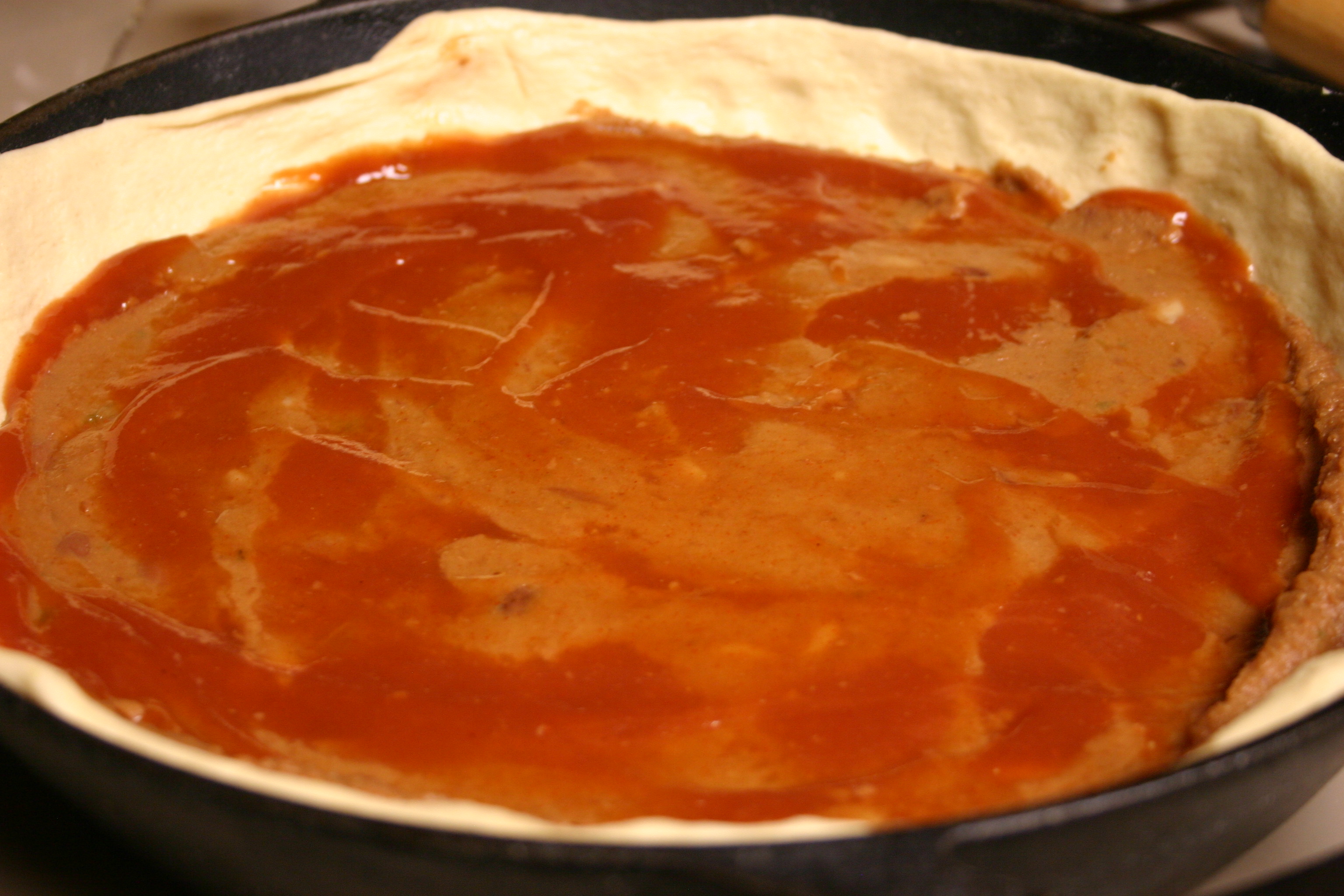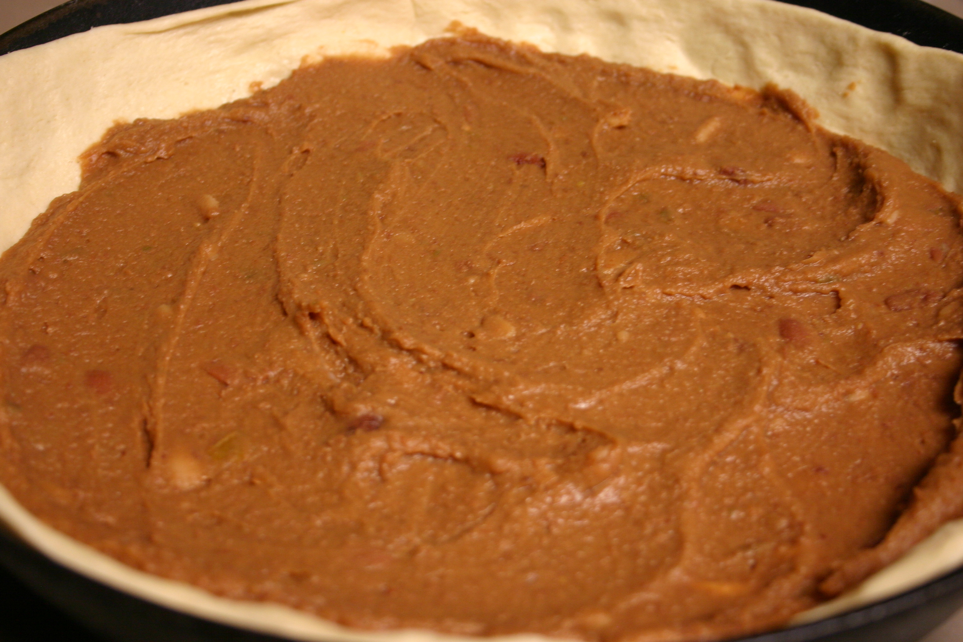 Warm refried beans with a little lard for a spreadable consistency. Spread refried beans over the raw crust. Spread taco sauce over beans, meat over the sauce. Top pizza with the cheese. Fold excess crust under for a thick “pizza” crust finish.