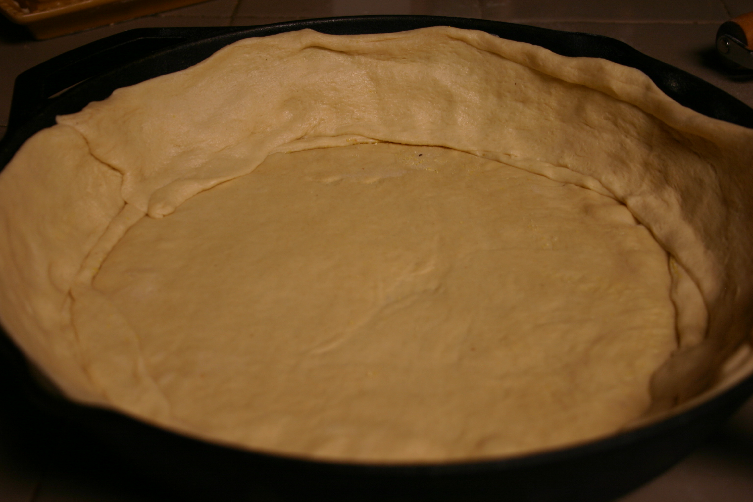 While the meat mixture is cooking, prepare the deep-dish skillet. Open 1 tube of dough, roll into a ball, then roll out to cover the bottom of the skillet. Open remaining tube, cut into strips. Use strips to build up sides for a deep dish. Pinch closed at the seams.