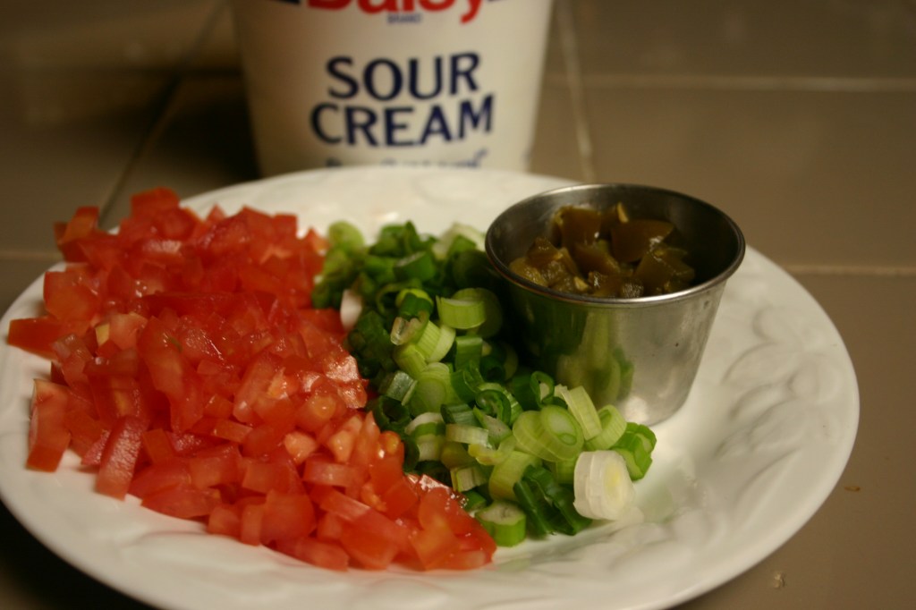 Remove pizza from oven. Let rest for 5 minutes. Dollop finished pizza with sour cream. Garnish with fresh tomatoes, green onions and diced jalapenos. Slice and enjoy.