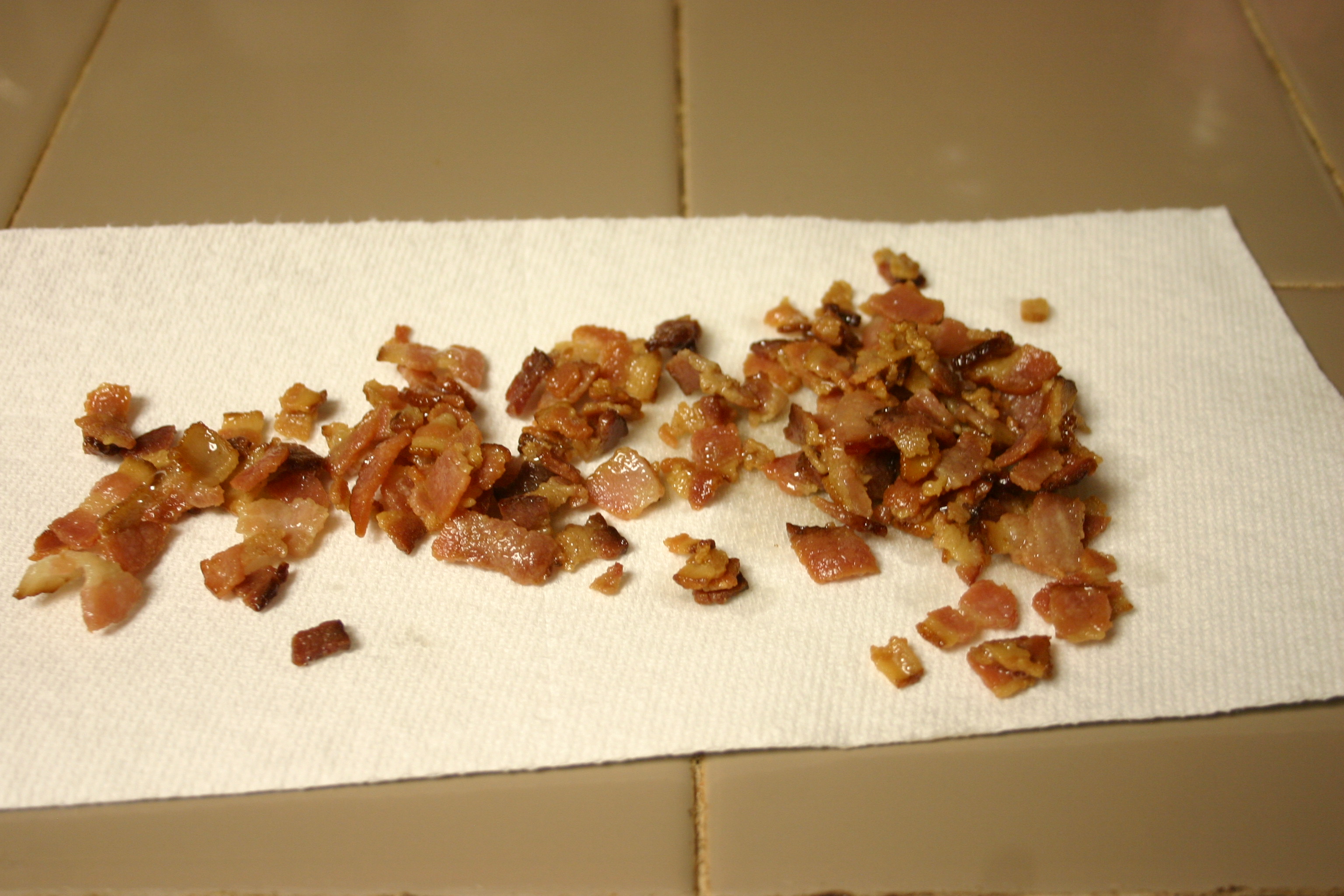 Dice bacon. Place in a skillet and fry until nicely brown. Remove from skillet with a slotted spoon. Drain on paper towels, set aside.