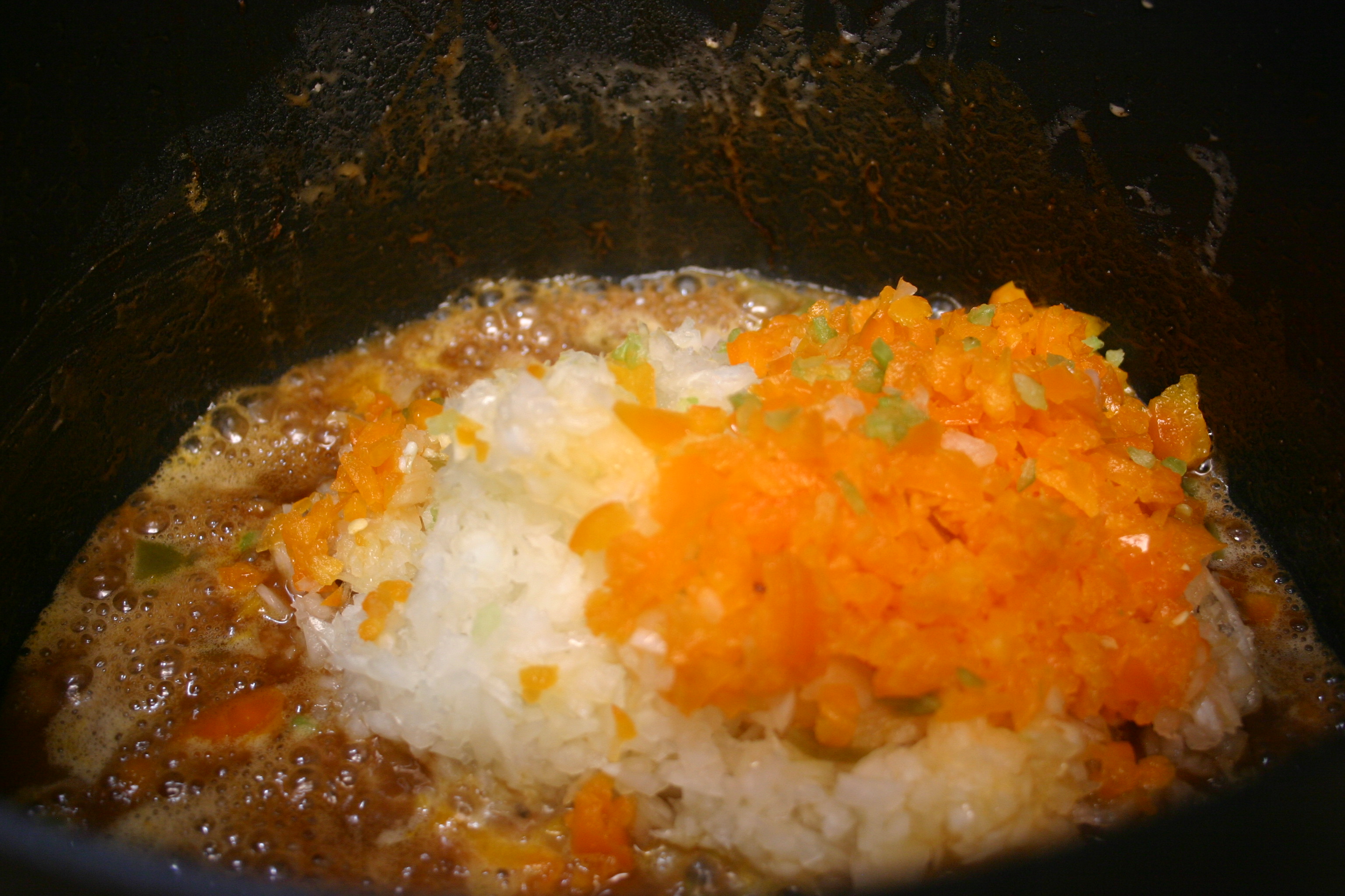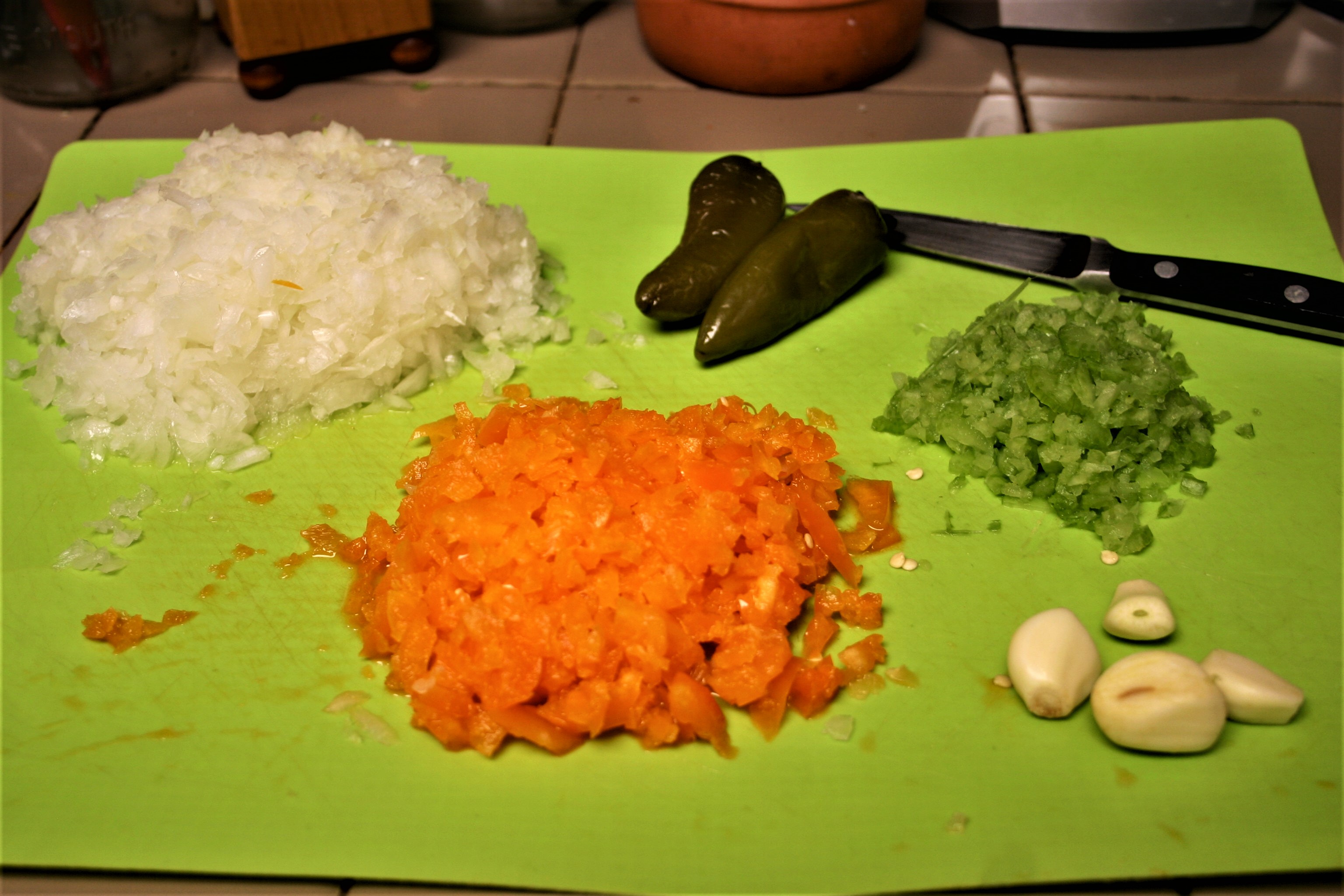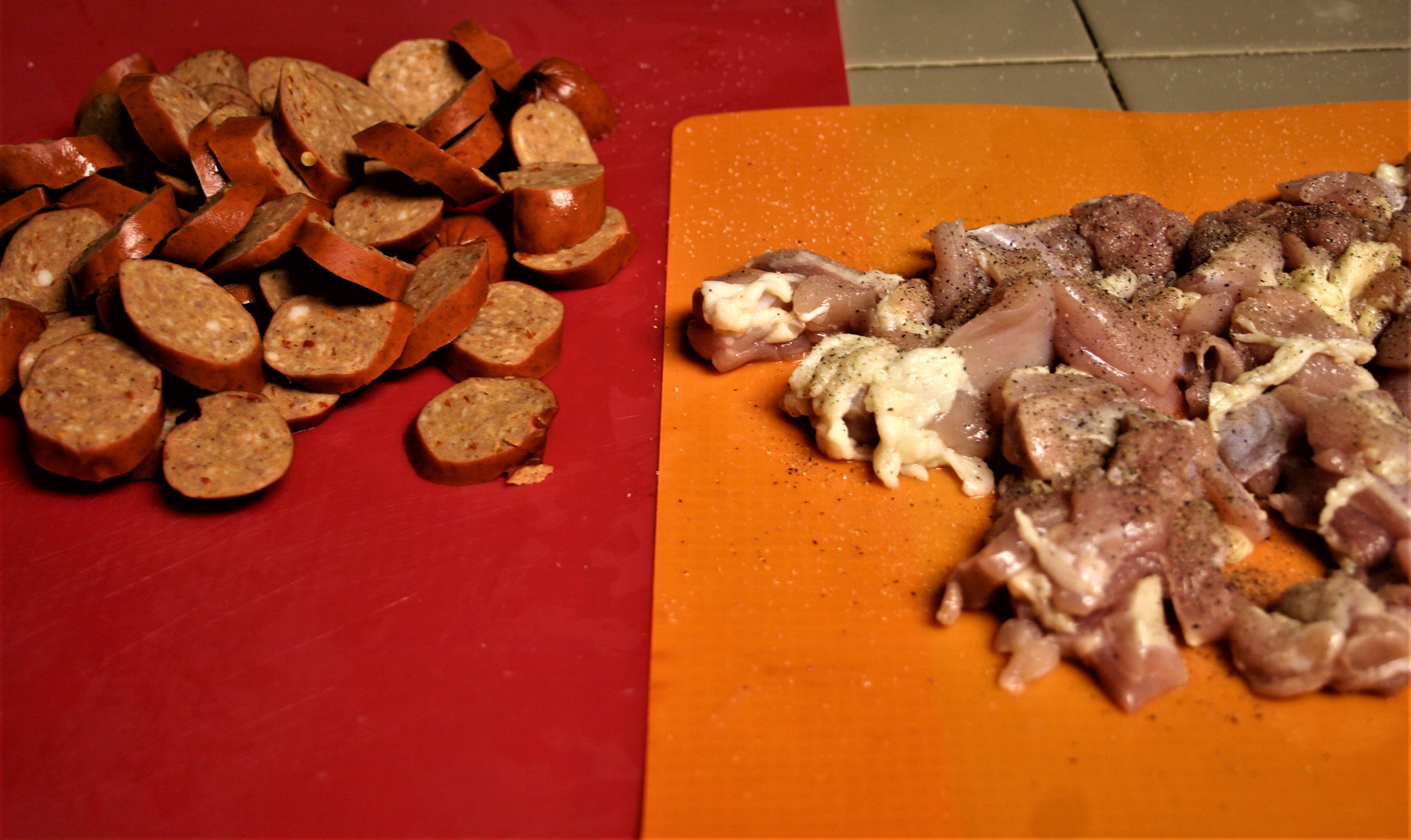 Cut chicken into bite-size pieces. Set aside. Slice sausage into 1/4-inch slices, set aside. Core, seed and finely dice bell pepper and jalapenos, set aside. Peel and finely dice onions and garlic, set aside. Clean and finely dice celery, set aside.