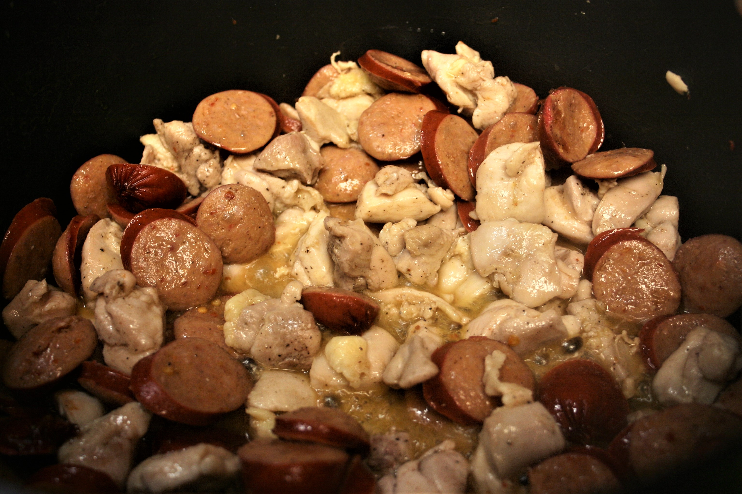 Season chicken with salt and pepper and add to the pan along with the sliced Andouille. Cook a couple minutes per side until browned. Set aside until ready to use.