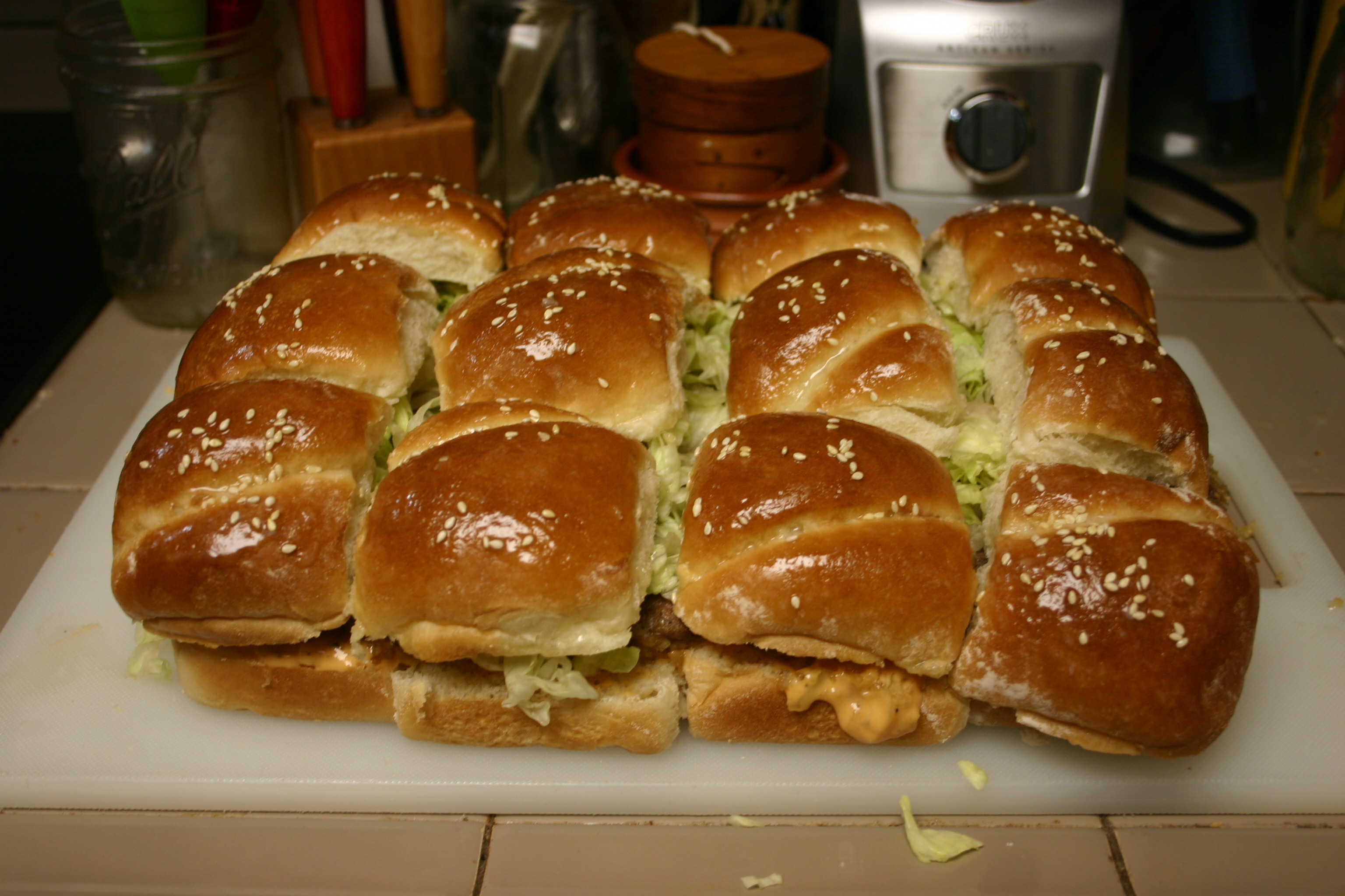 When ready to assemble, lift hamburger patty and place on top of the bottom buns. Top burger with pickle chips and some shredded lettuce. Place top buns over the burger bites. With a sharp knife, cut into squares. Serve and enjoy.