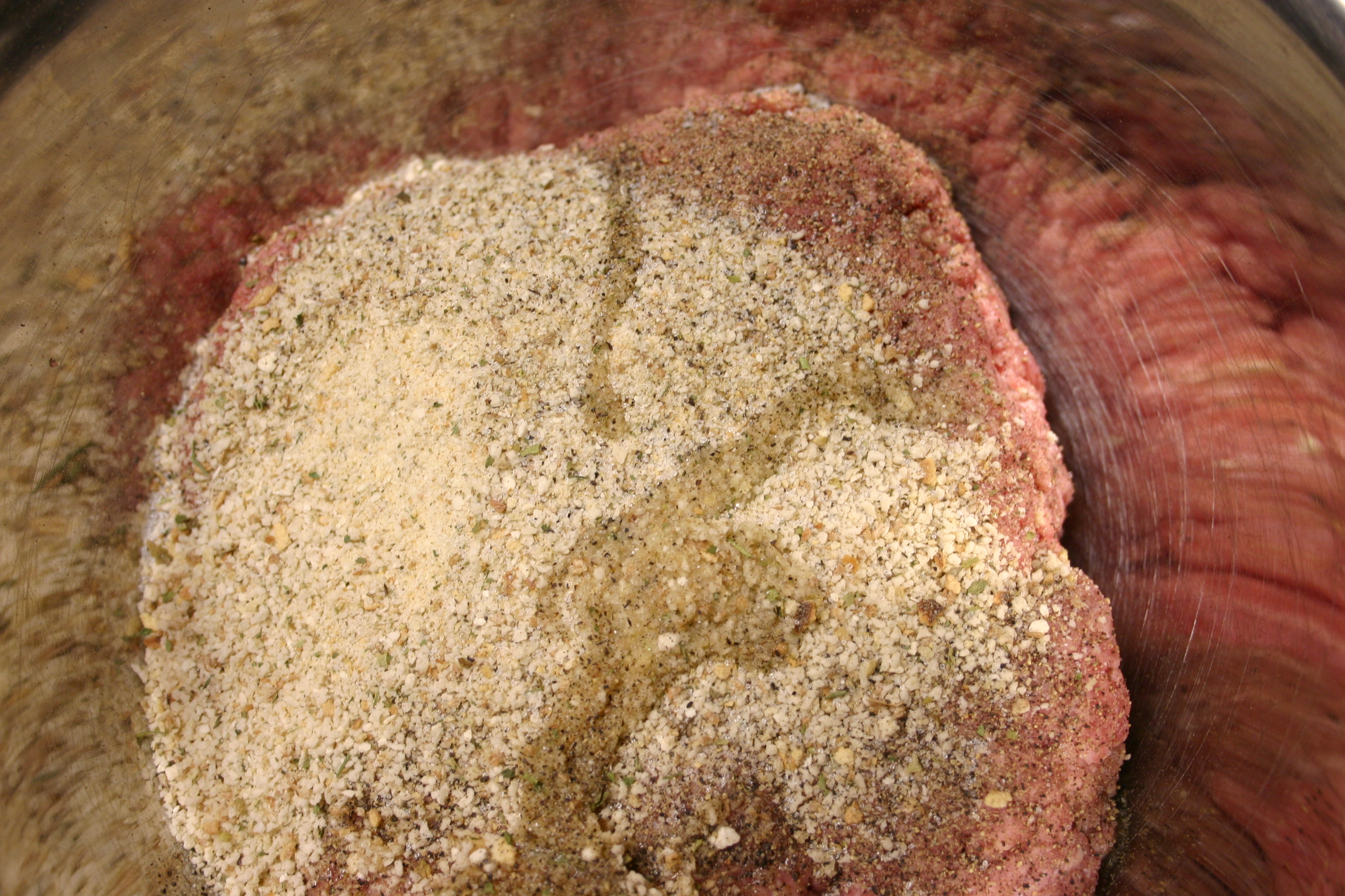 Combine ground beef, breadcrumbs, and egg. Press meat mixture out over the onions. Season with salt and pepper. With a wooden spoon, prick holes through the chuck mixture for ventilation while cooking.