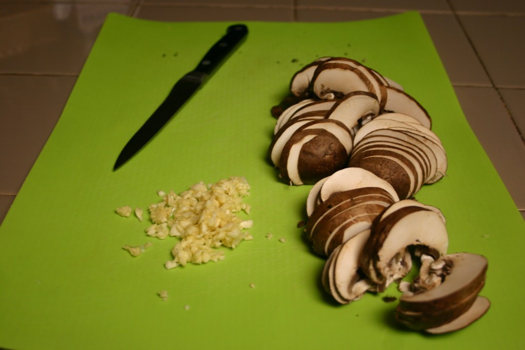 Clean and slice mushrooms, set aside. Peel and mince garlic, set aside.