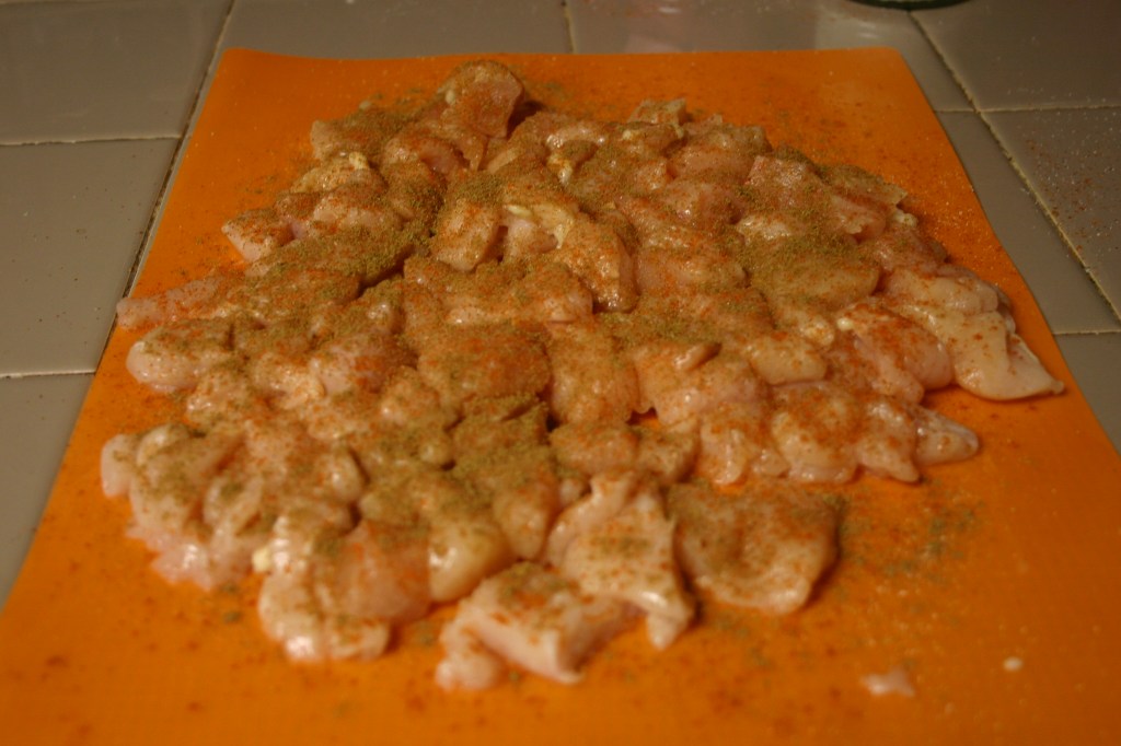 Dice chicken into bite-size pieces. Spread out in a single layer on the cutting boar. Season chicken with cumin, salt and Cayenne Pepper. Toss to coat, adding more seasoning as desired. Set aside.