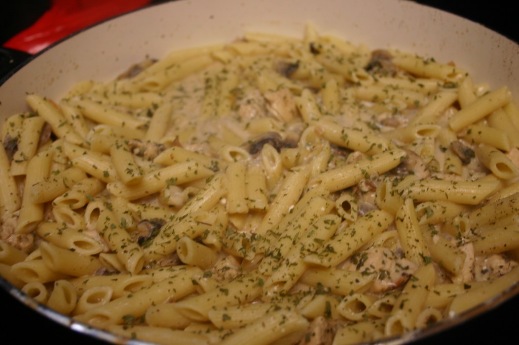 Place about half of the pasta in a large serving bowl. Pour about half the chicken mixture over the pasta. Toss in remaining pasta and chicken. Garnish with parsley flakes for a splash of color.