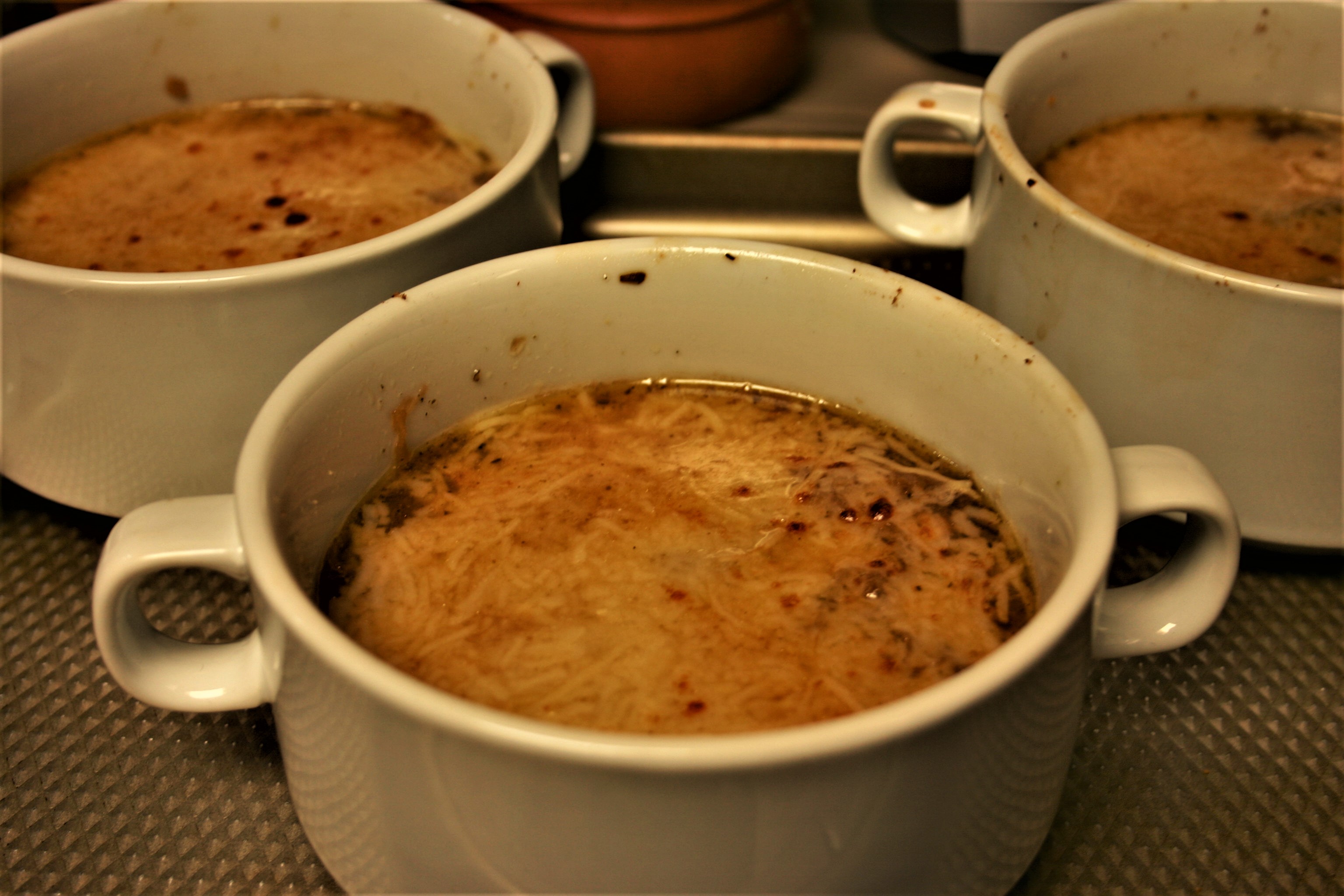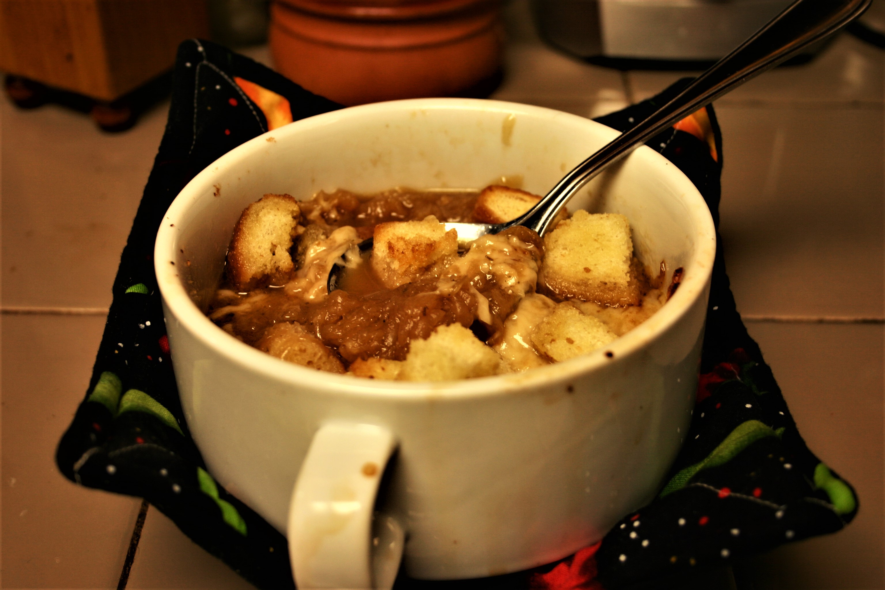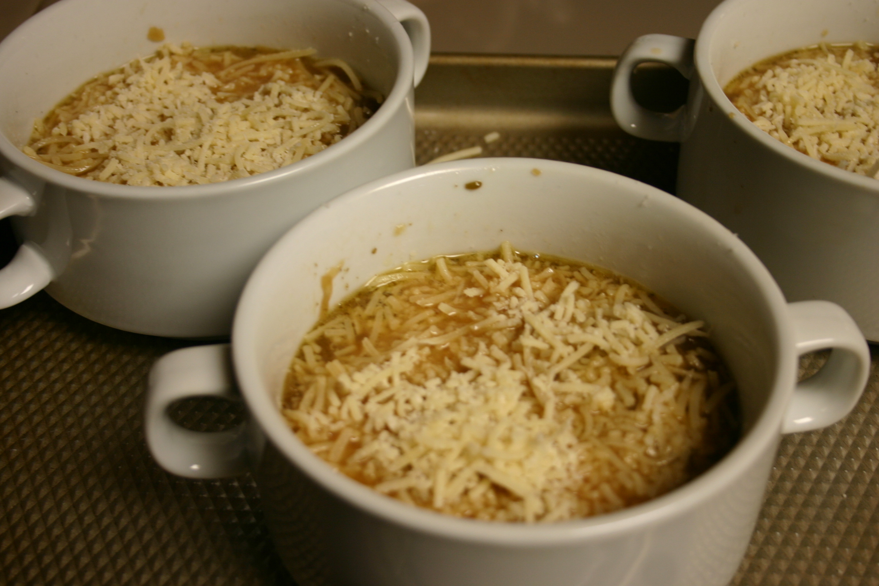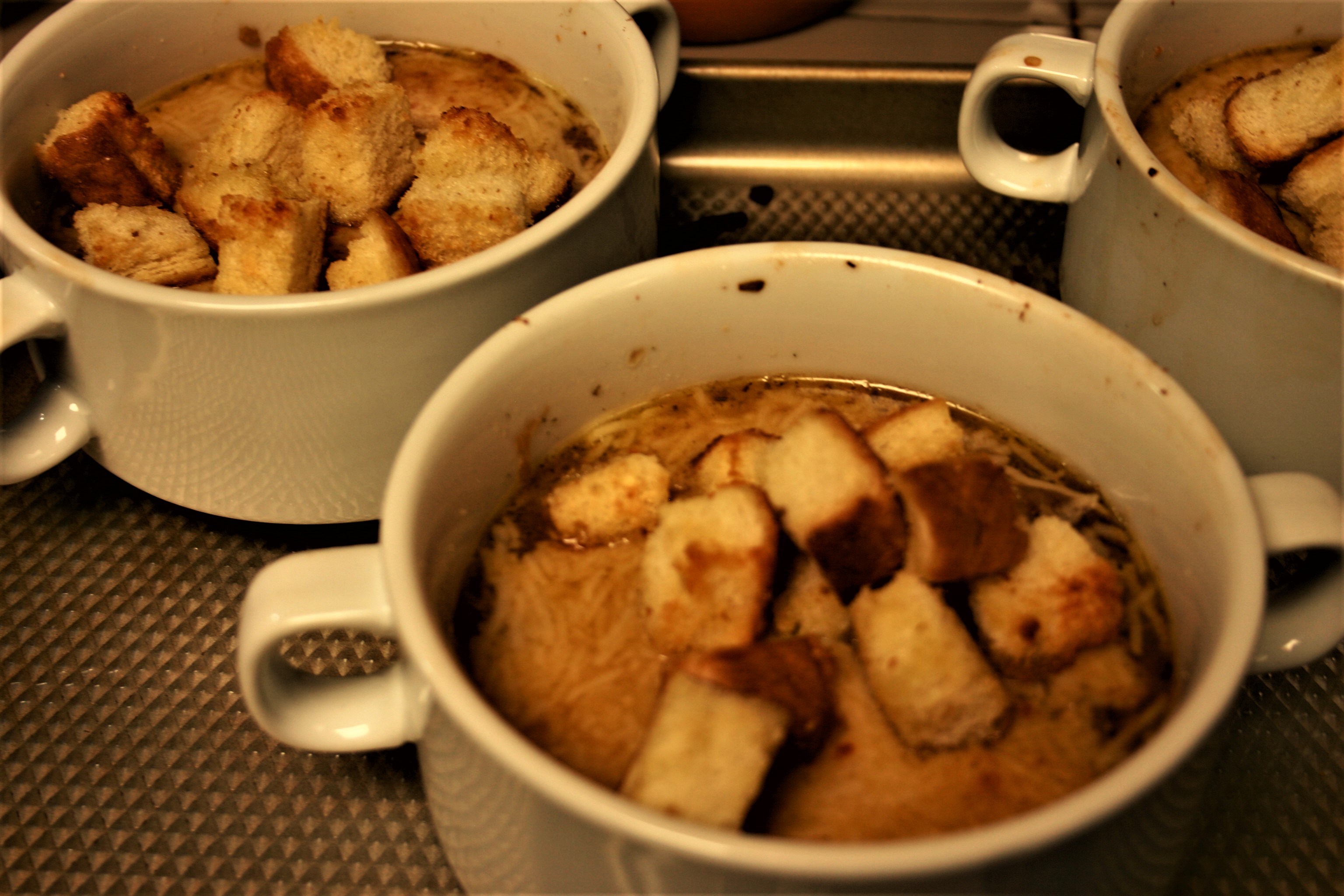 To serve, place six broiler-safe bowls or ramekins on baking sheets. Ladle about 3/4 cup soup into the bowls; top with cheese. Broil four-inches from heat until cheese is melted. Divide croutons; scatter over the melted cheese. Serve and enjoy.