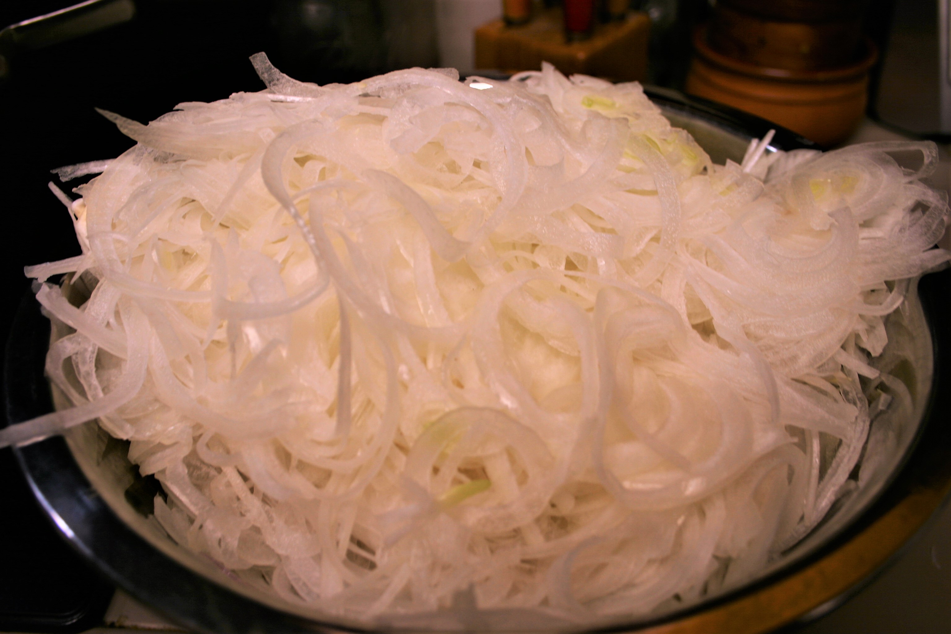 Peel and thinly slice onions, break apart an set aside. Peel and finely mince garlic cloves, set aside.
